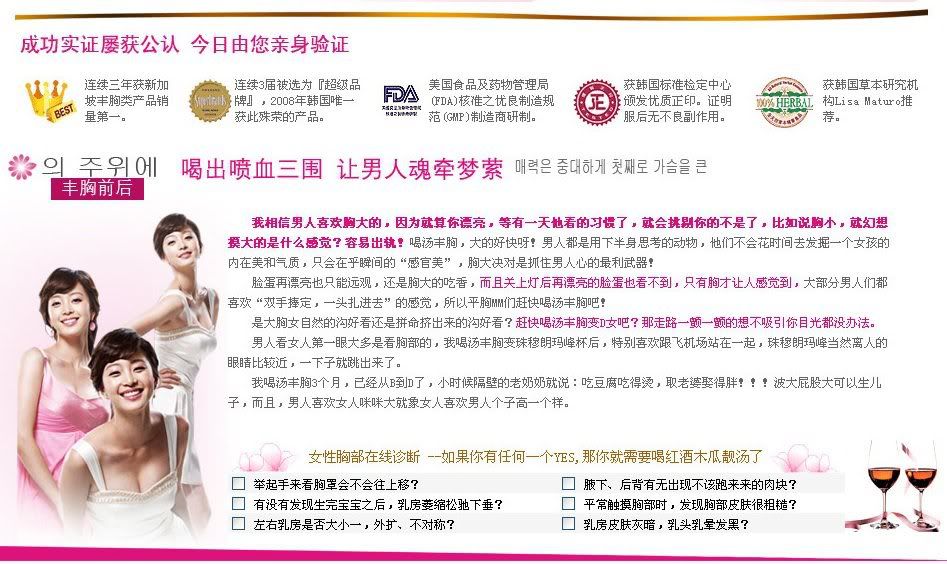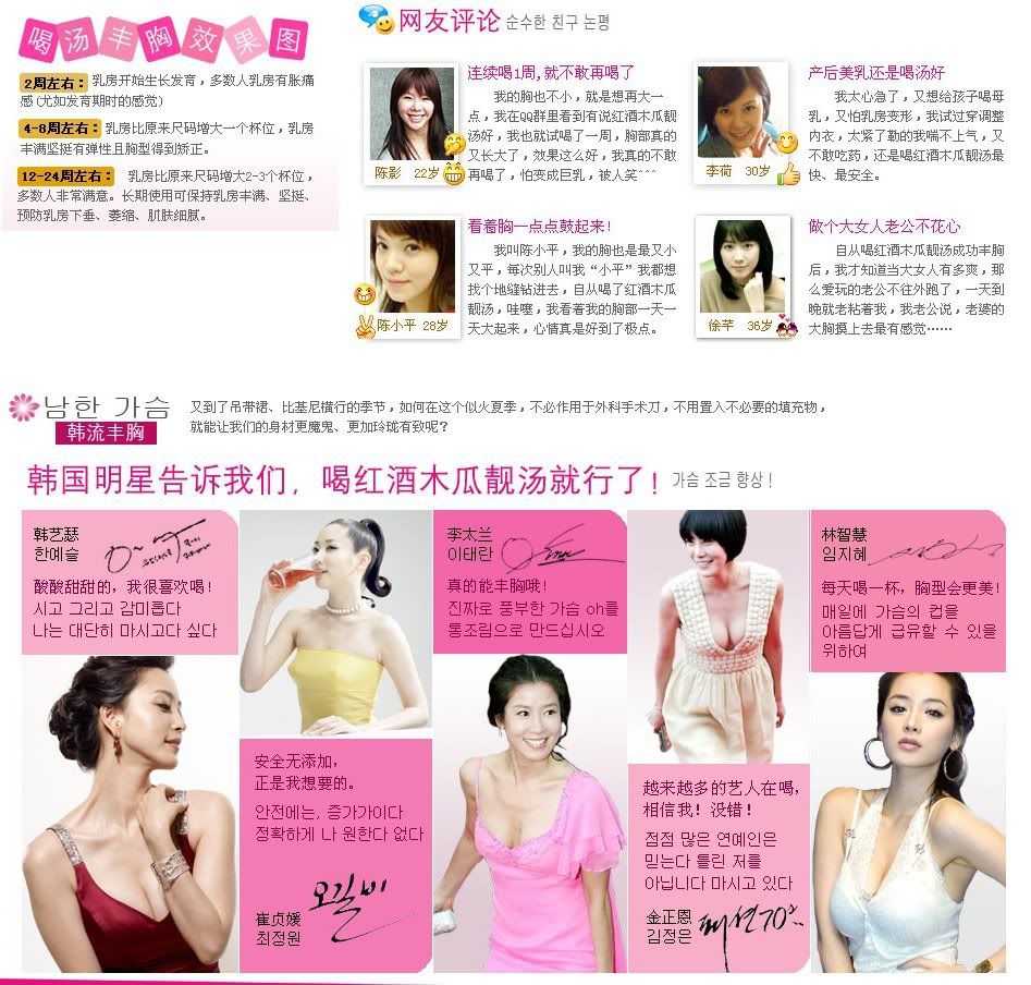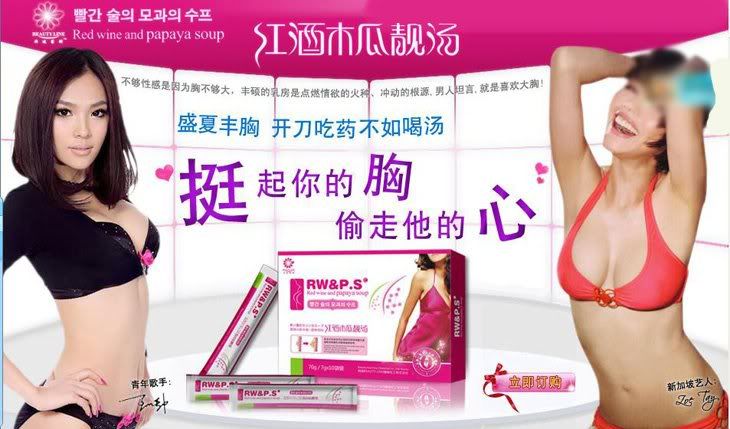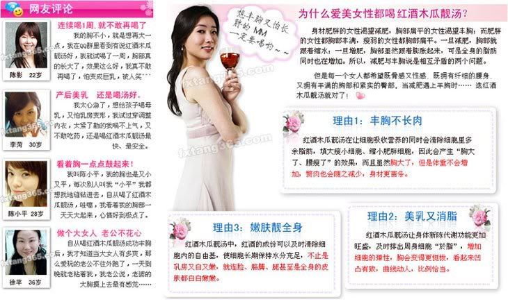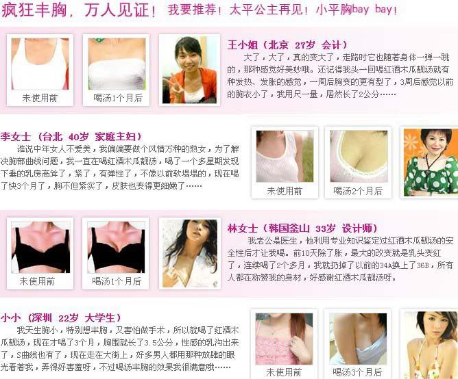 刚出道的时候,林志玲的胸部仅有小小的B罩杯,胸型也不是很完美。在她几乎放弃明星身份的时候,有朋友给志玲推荐一了款具有丰胸效果的红酒木瓜靓汤。因为听说具有丰胸嫩肤效果,所以便坚持服用了一个月,结果胸部变得越来越大,在节目主持中因为突涨的D胸而成为全场的焦点。真的性感,真的女人,30天喝出自然丰满,终于拥有黄金曲线~~