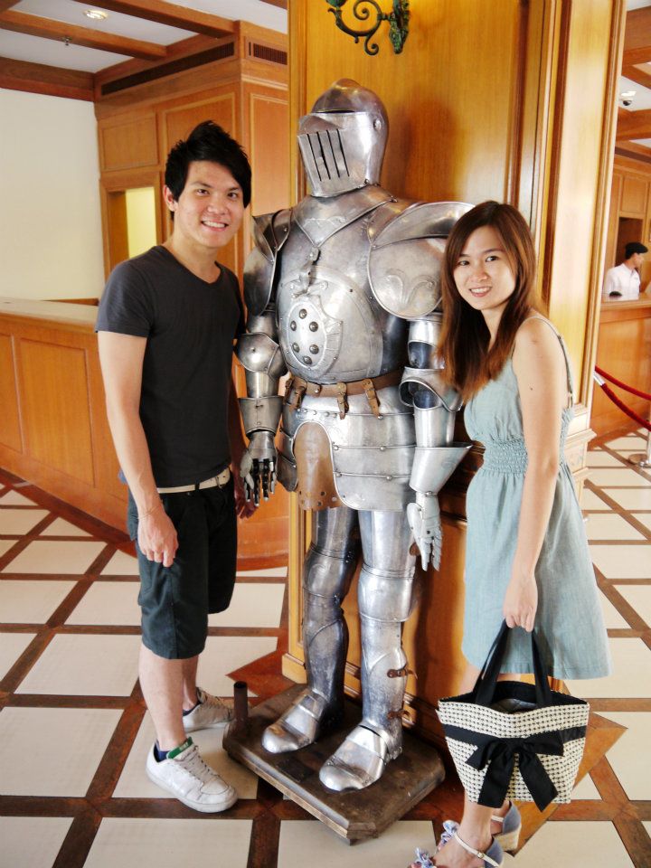 进去借酒店的厕所拍照,也借人家的欧洲中古世纪的盔甲拍一拍有点诡异!