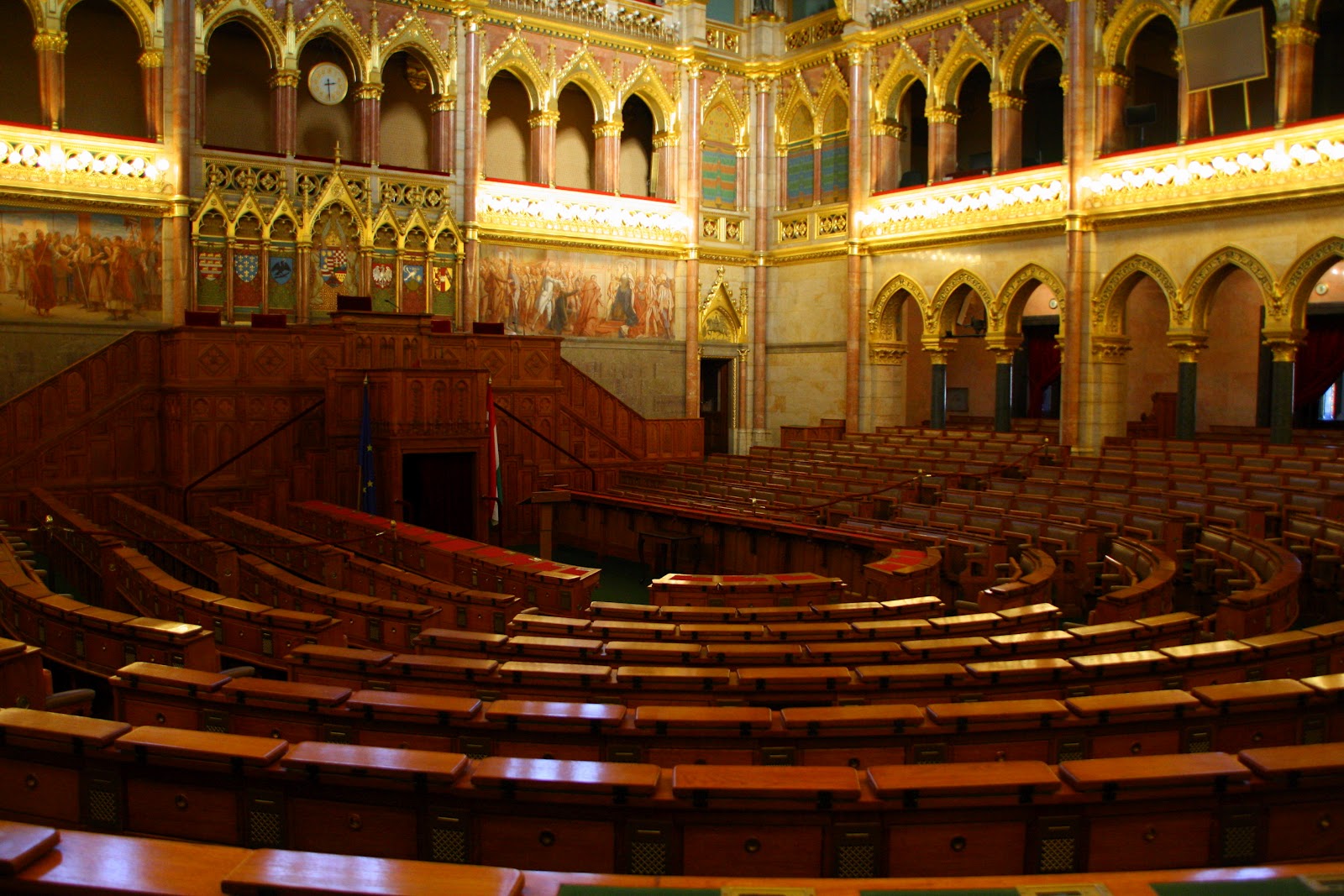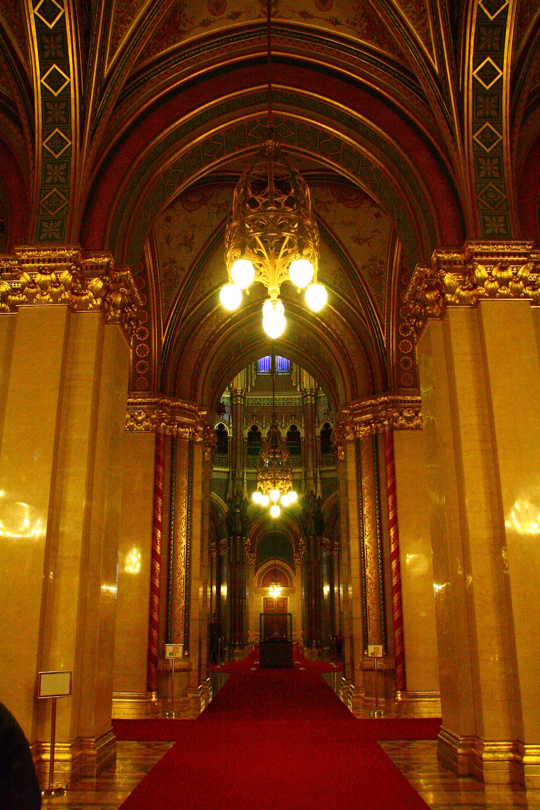 我们从前方一道侧门进入教堂里边,几缕阳光透过高大的彩窗,在大殿里洒下暖暖的光芒,为略为阴暗的大殿带来一股神圣庄严的气息。当眼睛经过了一段短暂的适应之后,这才清楚发现教堂内部的华丽程度堪比皇宫内院,尽显辉煌富丽景象,那些表面光滑的巨大深色大理石柱子,雕工精细的大理石浮雕,色彩斑斓的精美壁画与及绚烂的彩绘玻璃,简直美不言喻!穹顶华丽精美的镶嵌画记载了匈牙利第一任国王依斯特万(圣史蒂芬)的生平记事与及圣经里所记载的故事。阳光透过穹顶上的窗口倾泻下来,犹如天堂之光那般沐浴着竖立在大主坛正中央的圣史蒂芬大理石雕像,为大主坛增添一股神圣庄严的气息。位于主坛后方的礼拜堂内存放着一只木乃伊状的右手,经过考古验证,这就是圣史蒂芬的右手,是这里最为神圣的物件。还以为有机会可以一览实物,没想到我们只能从远处观望一只精美华丽的黄金盒子而已,根本就没法一睹收藏在黄金盒内的圣物。