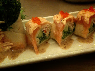 這道明太子鮭魚捲還算不錯. 飯用捲餅皮代替, 裹上生菜青瓜蟹條, 外層鮭魚美奶滋加上魚卵, 外面淋上少許的芝麻醬, 這種組合要做得不好吃也不簡單啊~ RM12