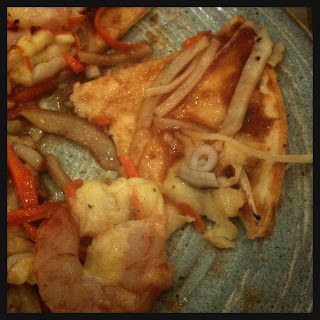 算了, 回到Pizza的部分. 這個海鮮Pizza有海鮮的部分有蝦子以及切絲的Sotong, 蔬菜的部分除了叫她不要放的青椒外, 還有大蔥, 紅蘿蔔, 還有一樣我不是很確定, 感覺是白蘿蔔的樣子. 底下鋪了一層Okonomi的醬料. 吃起來還不錯, 只不過, 這是我第一次吃到Pizza是餅皮跟餡料是完全分離的~意思是說, 你無法用手像吃一般Pizza一樣把它拿起來直接放進嘴裡, 因為餡料會直接滑下.