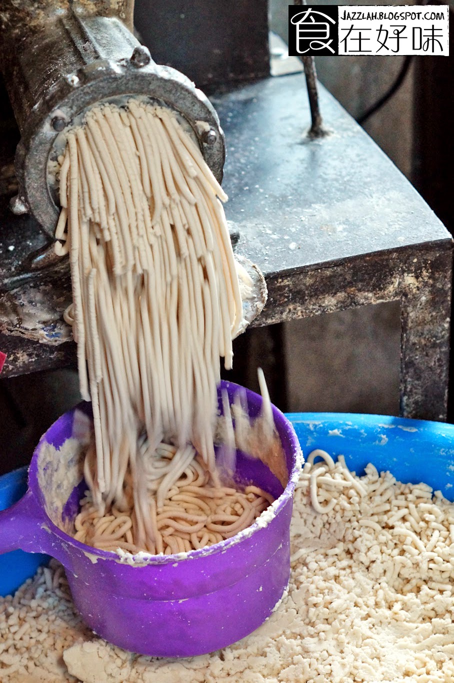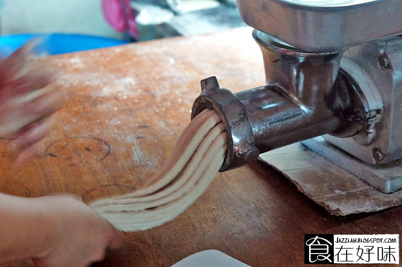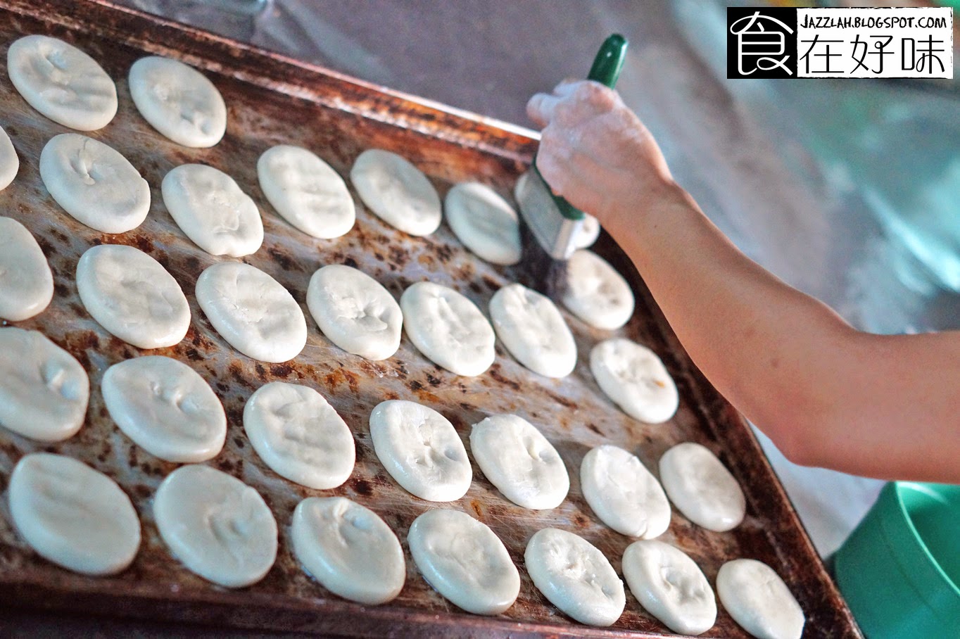 首先也者向我们示范制作香饼的过程,先把搅拌好的皮放入类似搅肉机器把它搅成一条条 而这个程序是需要反复三四次,这样才能把皮搅得松软一些 而这是属于香饼的饼皮的一部分,当中加入了水、面粉和….猪油! 只有加入猪油的饼皮才有一种独特香气!这是很多逐渐迈向Halal的知名品牌所办不到的 之后把皮搓成一粒粒,排成一排排
