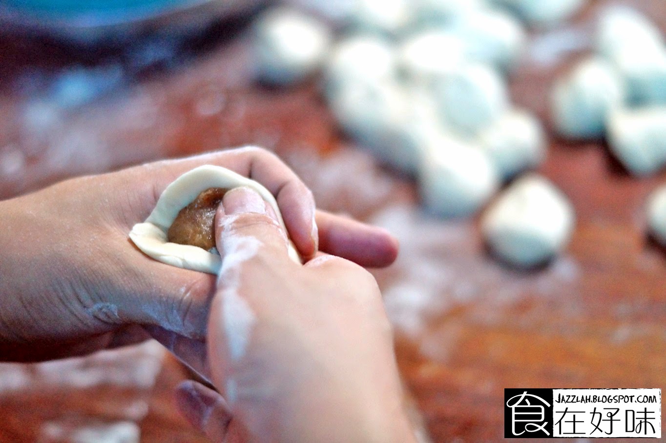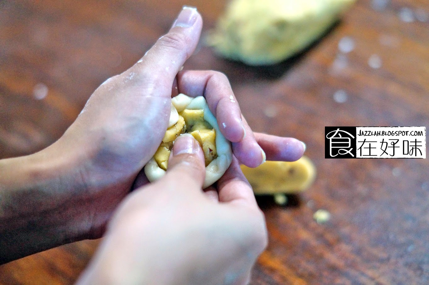 由于当天只是示范给我们看所以铁桶内搅拌好的豆沙并不多,平时都是满满一个铁桶的 黄透的豆沙饼搭配了一些炸葱在内,正是豆沙饼的精华所在 之后把豆沙加入到一粒粒的酥皮+油皮的综合皮,再捏成一粒粒龙珠形状即可