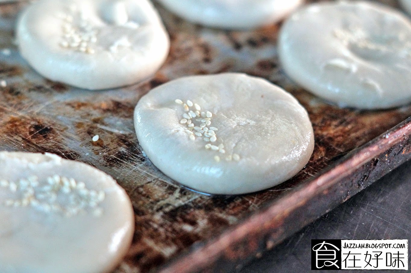 把扁圆的香饼放在烘烤盘上,用刷子涂上一层麦芽水 这样为了让香饼比较有色泽而且表层不容易龟裂 之后加上芝麻点缀,放入烤炉烘烤25分钟,热烘烘的香饼就大公告成啦