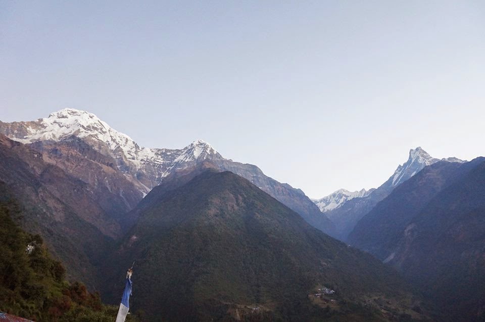 <<25-Nov-2014>> (徒步第四天) 睡醒時發現DOVAN這里的凌晨已蠻冷的(海拔2500M以上了), 換上另一件更耐寒的外套大概6AM我走出房間, 往北邊看去, 的確雪山是有,但風景不是很美, 因為兩旁的山(峽谷)都遮了雪山的大部份, 同時我發覺接近雪山後, 雪山容易被旁邊的山遮著! 看來是要到達MBC或ABC才有最正雪山風景看了!