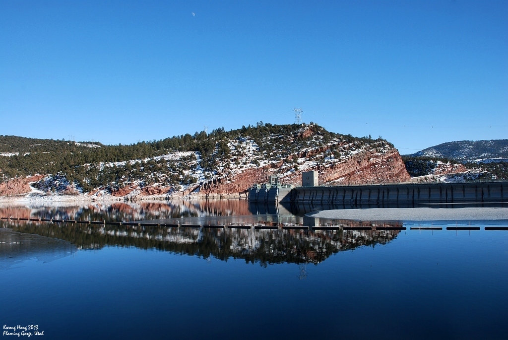 Flaming Gorge水坝是我的终点站,水坝上的水犹如平静的湖面,把山景折射出美丽的倒影,又是一番不同景象。回程后我才知道附近有个观景点能俯瞰水坝湖景,可惜错过成为遗憾。Flaming Gorge其实也称不上是美国或者犹他/怀俄明两州最著名漂亮的景区,可对处于寒冷冬天的我来说,那是个完美的美国初体验。后来我开车走过80号大道回到盐湖城,中间也经过一些特色小镇,可是最特别的那次驾驶,绕着Flaming Gorge景区,亲身体验了美国的公路行。