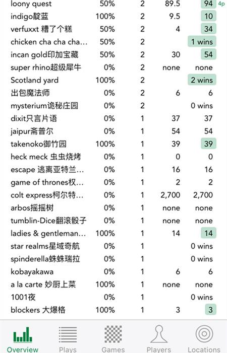 对于桌游玩家来说,桌游俨然已成为生活中重要的一部分,就像有人习惯写日记一样,有不少玩家,也习惯把玩过的游戏记录下来,以便于以后回顾。但对于我来说,要记录一场游戏实在是很麻烦的事,需要打开电脑登上BGG,找到玩的那个游戏,再进行记录,而且BGG的游戏记录能够呈现的信息太少,所以我都懒得记录。直到有一天,我发现了Board Game stats这个APP,并从此养成了开局必记录的习惯,因为这绝对是IOS上最最好用的开局记录与统计软件!没有之一! Board Game stats操作简单却功能强大,它可以记录开局的地点、玩家、分数,可以对开局进行点评并上传图片,然后同步到BGG或云端。它可以多维度生成统计和图表,直观的反映相关数据,并能将统计分享至facebook和Twitter,或是通过邮件导出! 具体功能包括: 添加游戏,设置图片和计分规则; 可以将游戏链接至BGG,获得更多信息; 添加玩家和地点,包括匿名玩家,可以为玩家添加头像,并将玩家与BGG ID进行链接, 将游戏开局同步至BGG,也可以导入在BGG上已经记录过的开局; 分享开局至社交页面(脸书和推特……我们可以忽略这个功能); 分游戏、玩家、地点、开局等维度生成统计以供浏览; 导入和导出开局记录;