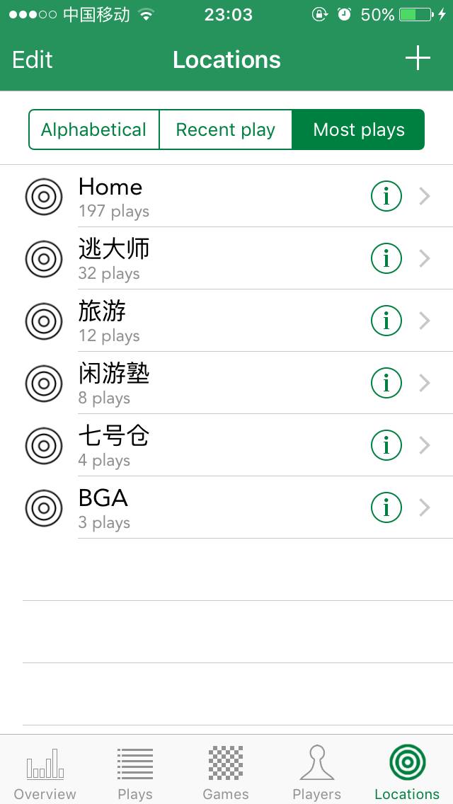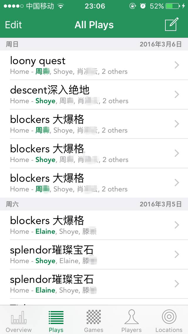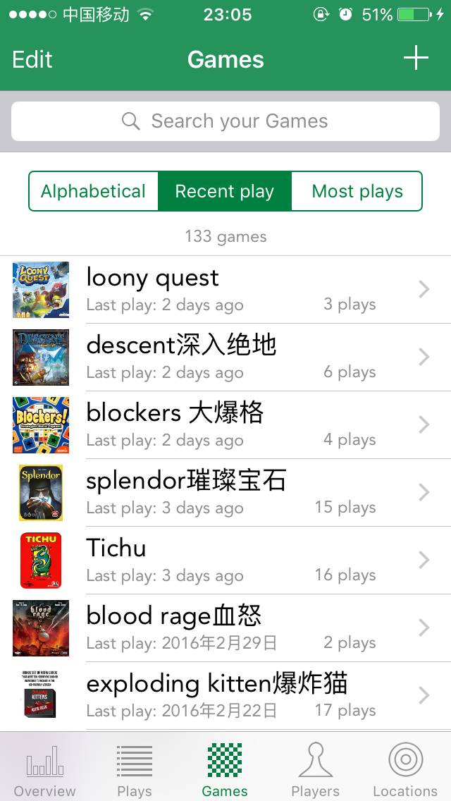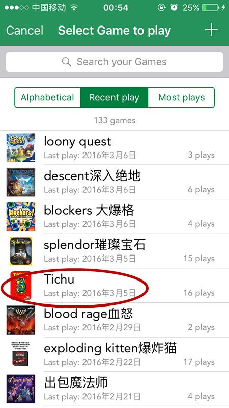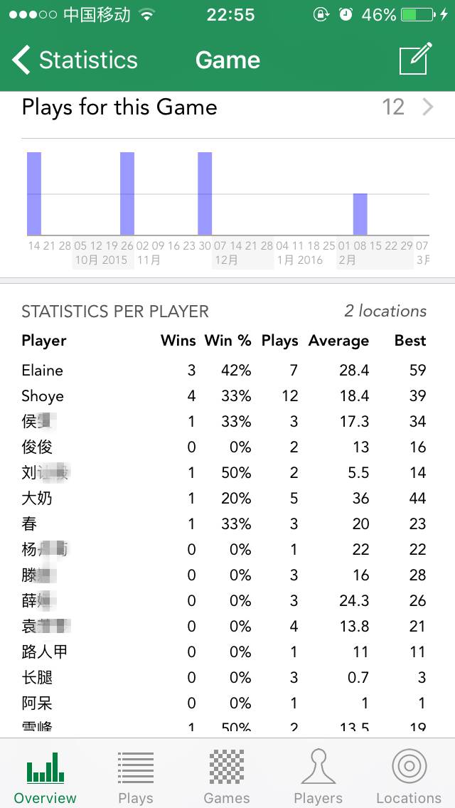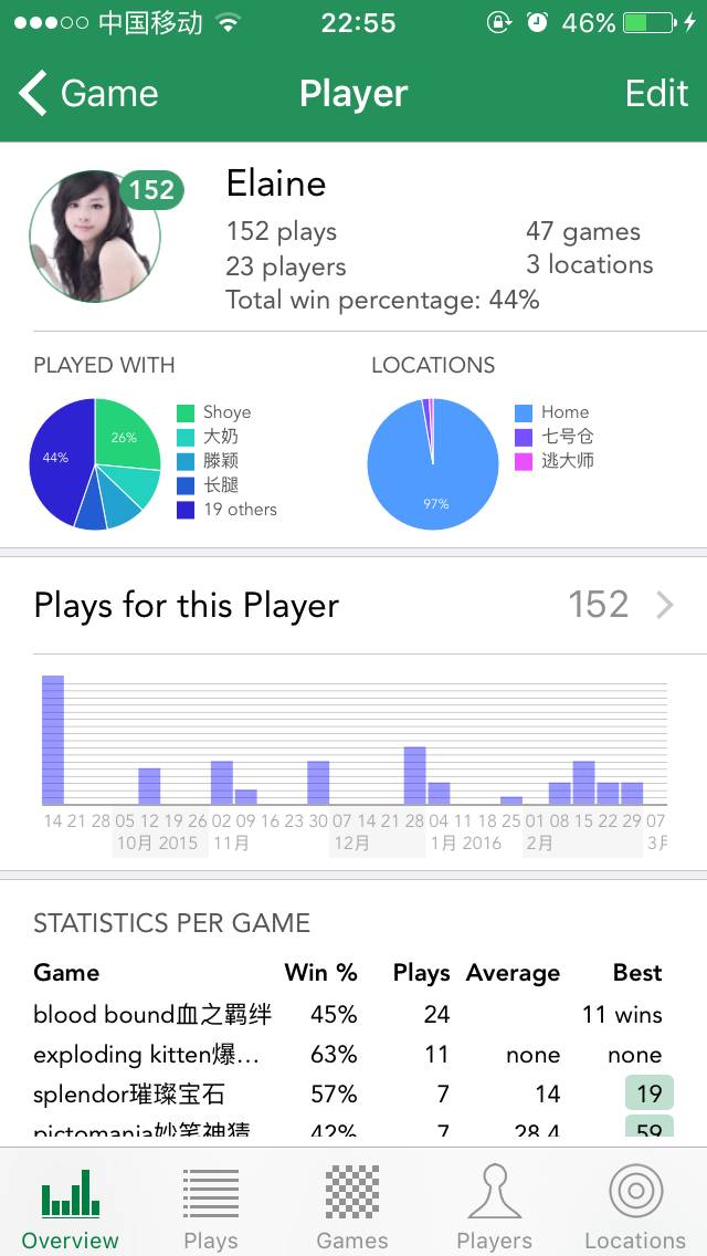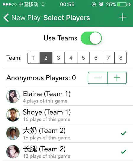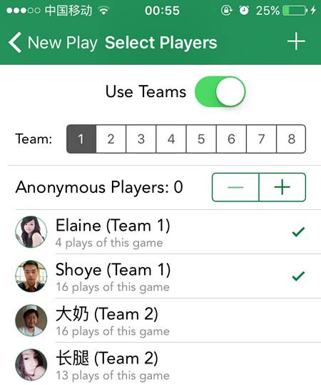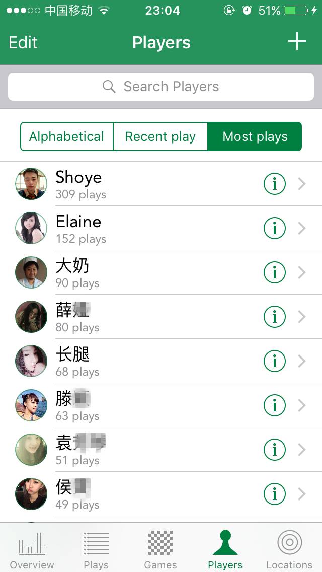 玩家界面与游戏界面类似,可以新增玩家,可以通过搜索、字母排序、最近玩过的、最常玩过的玩家来查找玩家。 从上面可以看出,我在这个app上记录了309场游戏,其次是Elaine,陪我玩过152场游戏。