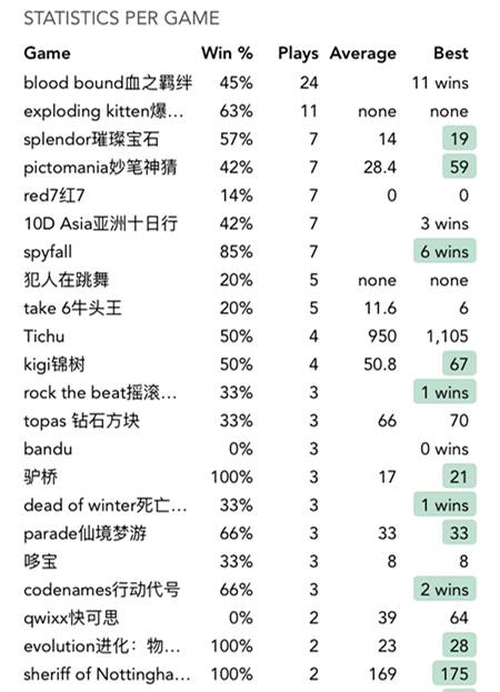 这里记录了她所有的游戏记录,包括胜率、胜利次数、开局次数、参与次数、平均分、最高分等等。她玩过47款共152次游戏,总胜率为44%,从她的数据可以看出……绝大部分游戏她都保持了较高的胜率,实在是个可怕的对手!(从游戏列表再次看出,我是个毛线玩家!!!)但是从陪我玩过152场来看,她是个好老婆^_^