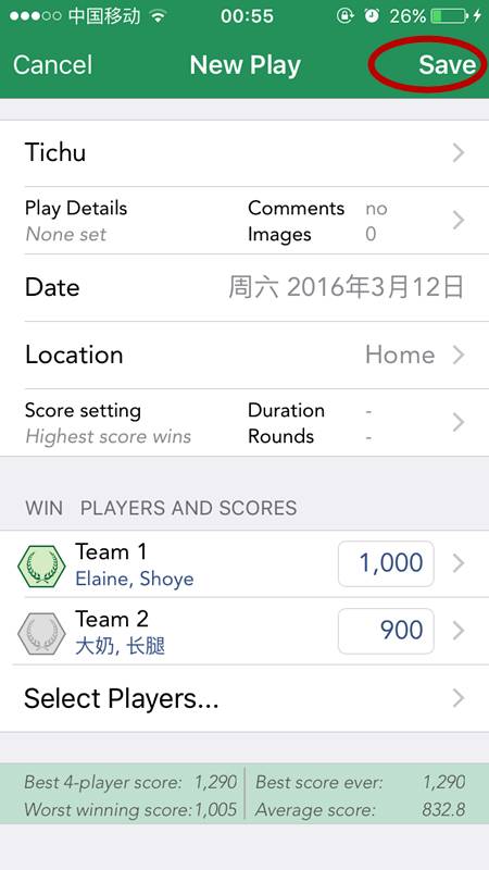 最后填写分数,app会根据游戏的计分规则,自动判断胜负。在Comments上填写个人评价、感受等等,再添加图片,然后点击SAVE就可以了。如果游戏不需要分数,则点击玩家名字前方的6边形符号使其变绿,则该玩家为胜者。如果在设置菜单中已经设置了自动同步至BGG,则该游戏记录会自动上传。