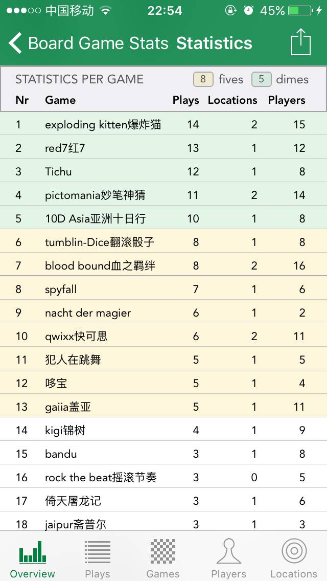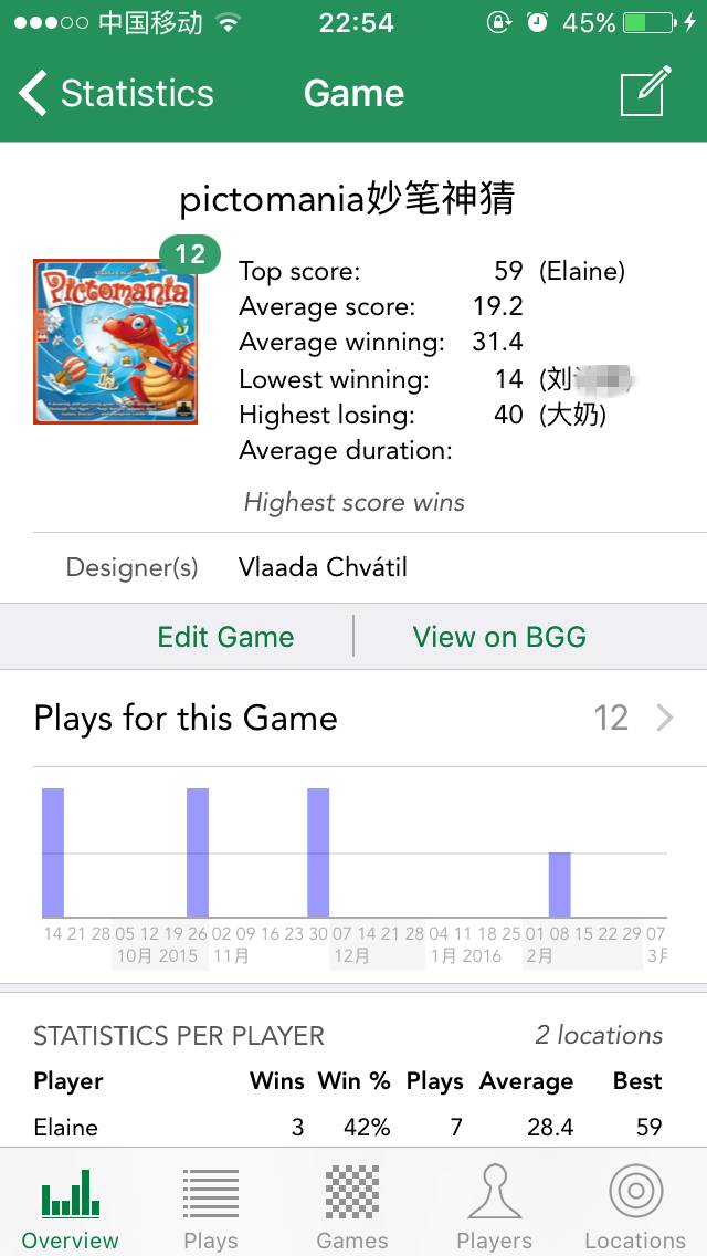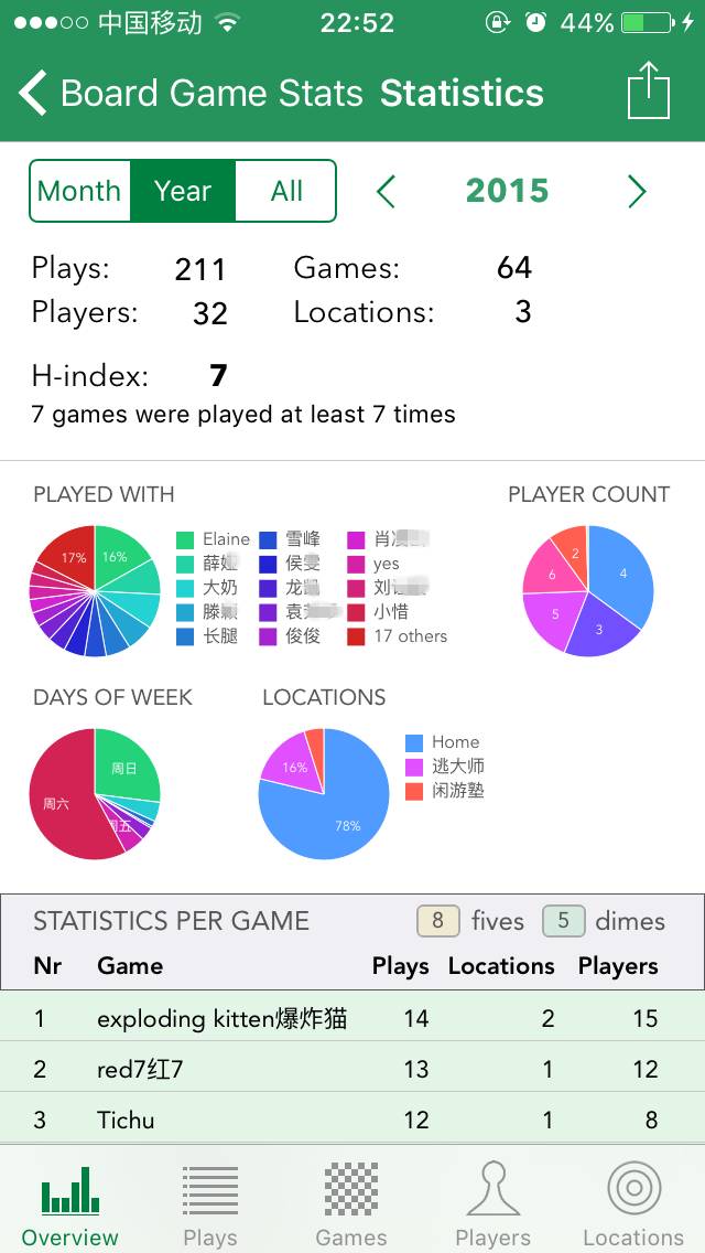 概览界面中可以以月度、年度、所有时间三个时间维度查看统计,从界面中可以看出,2015年我总共和32个玩家在3个地点开了64个游戏,211局。我主要在周六周日活动,最常活动的地点是家中,最常进行的是4人局和3人局,和我玩得最多的玩家是Elaine和小惜,我玩过的最多的游戏分别是爆炸猫、红7和Tichu(没错!!我就是毛线玩家!)。