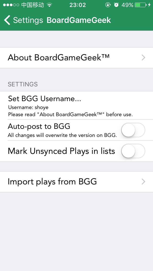 我们只需要设置好BGG用户名并打开自动同步至BGG,那么每次新增的开局记录都会自动同步至BGG,其他的设置基本上不用管了。