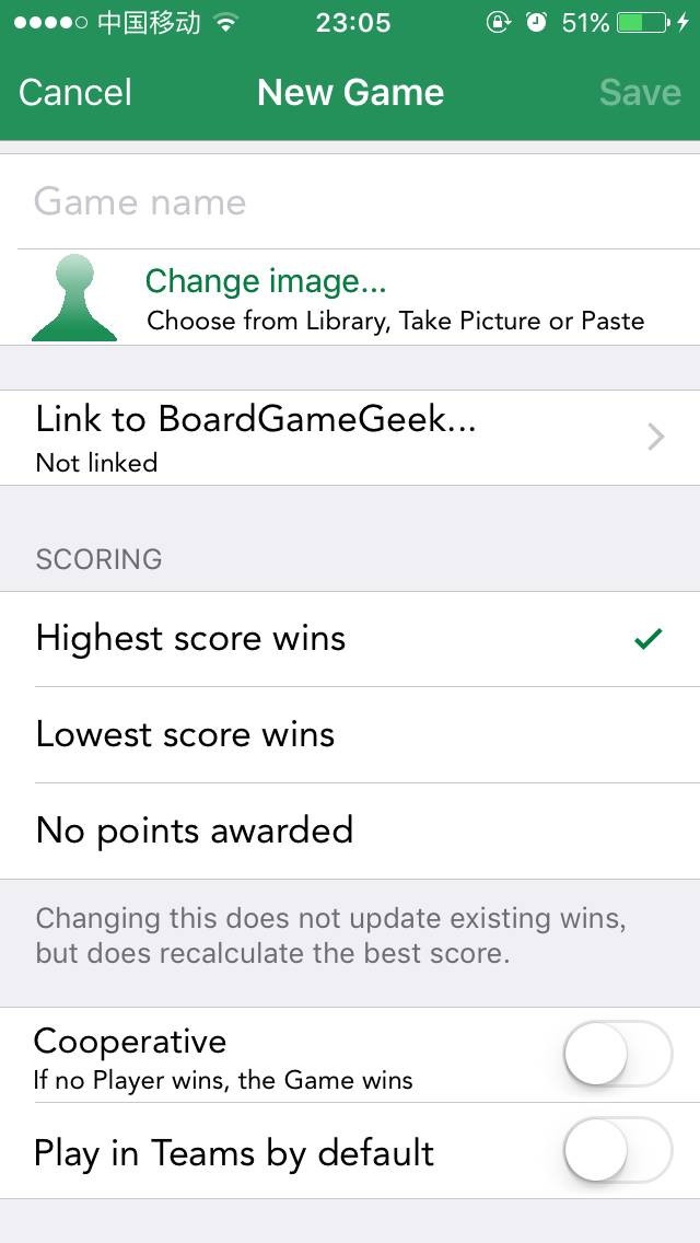 新增游戏时,先输入英文名,然后点击链接到BGG,选择对应的游戏进行链接,链接成功会自动更新封面,之后就可以添加中文名。 然后选择游戏的计分方式,最高分获胜、最低分获胜或无需分数。 接下来选择游戏模式,默认情况下游戏都是对抗性,如果是合作游戏,需要打开Cooperative,如果是组队游戏,则打开默认组队。