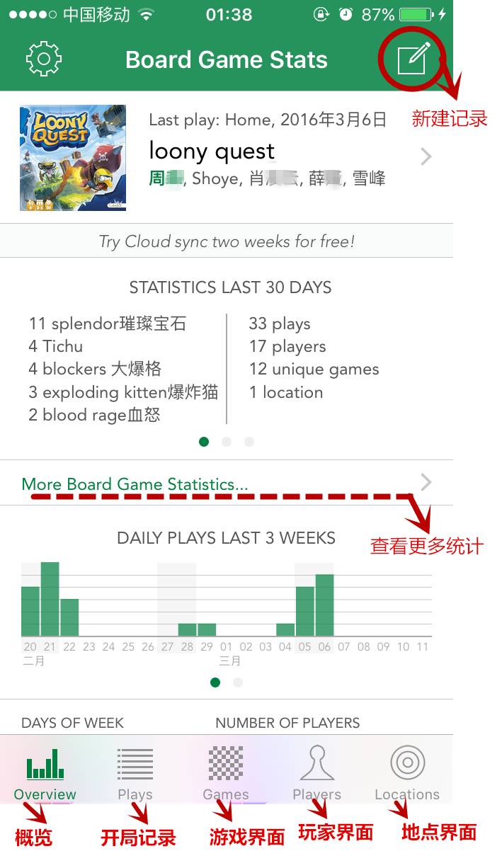 废话少说,下面让我手把手教你玩转BG Stats,首先让我们先来看看APP的界面。 App的主界面是默认显示最后一次玩过的游戏,会显示地点、时间、游戏名、玩家名,点击右侧箭头会进入详细的记录界面。 左上的齿轮符号是设置菜单,右侧是新建开局记录 中间上半部分显示的是最近30天玩过的游戏和次数 正中的More Board GameStatistics,点击会进入概览界面,显示更多统计 中间下半部分则显示最近3个星期开局日期和次数 最下面是常用的5大界面,分别是概览、开局记录、游戏界面、玩家界面和地点界面。 概览中会形成统计图表供你查看。 开局记录则会显示日期和最近玩过的游戏。 游戏界面用来添加和设置游戏,并可以查看游戏统计。 玩家界面用来添加玩家,并可以查看玩家统计。 地点界面用来添加地点,并可以查看地点统计。