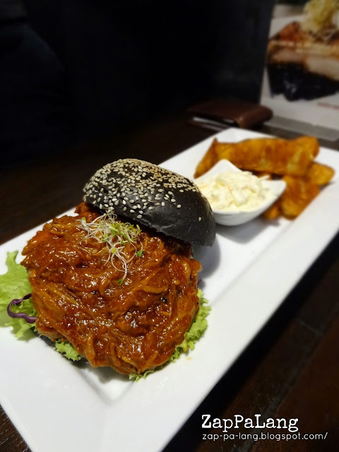 某人对于手撕肉 pulled pork 有特殊的情意结,所以特别点了用 pulled pork 做成的 Irish pork burger。这里的汉堡都是用竹炭面包做成的,黑黑的芝麻面包看起来就是健康一点,感觉上吃汉堡的内疚感也减少了。