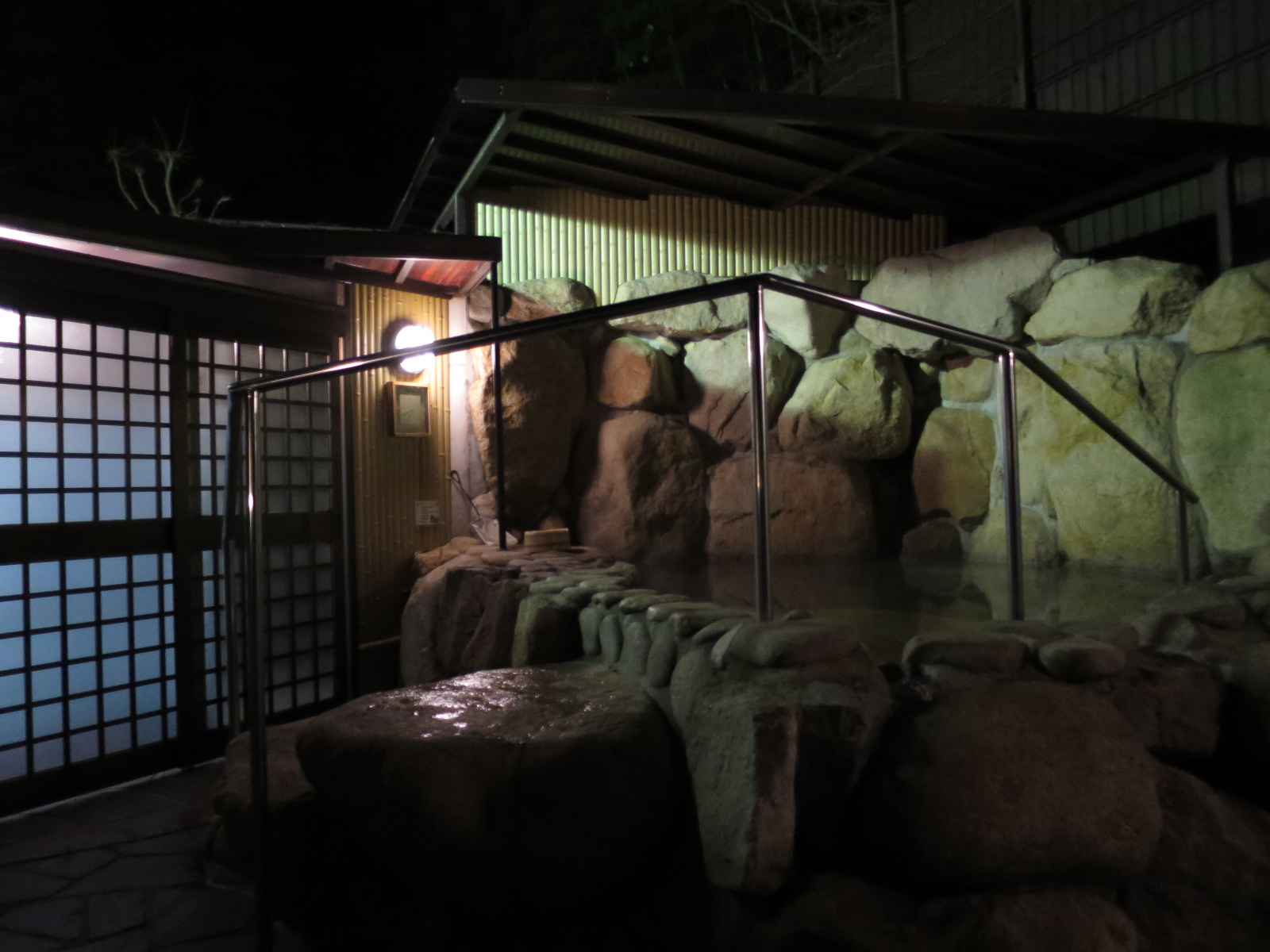 晚上气温很低,我们由房间出来,要出到户外的通道,虽然通道是有盖走廊,但我们只穿浴衣,实在是寒风刺骨,冷得要跑下去。来到贷切风吕里,还要先洗澡,但只有冷水! 洗好就立即来到池边,哗,水很烫呢!这个风吕是露天的,我上身给冷风吹着,慢慢一点一点的伸着脚进水里,直至可以整个人浸进水里。浸着温泉十分舒服,全身和暖的,实在不想上水。