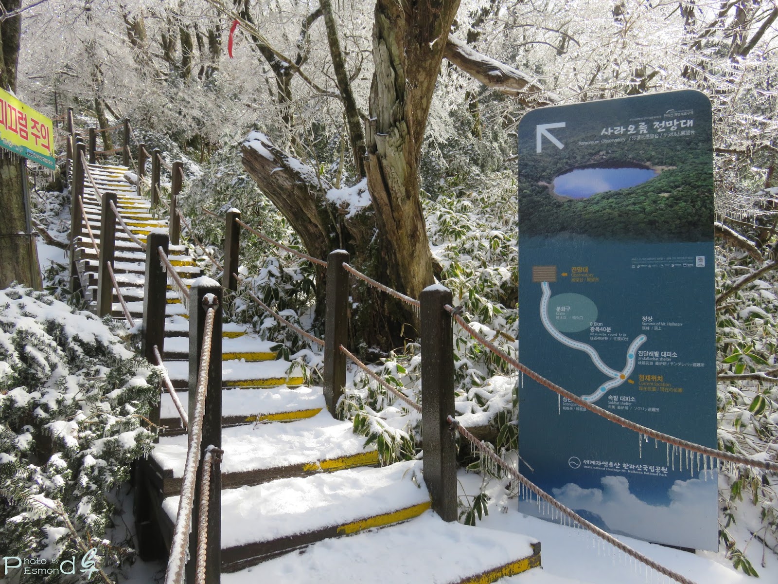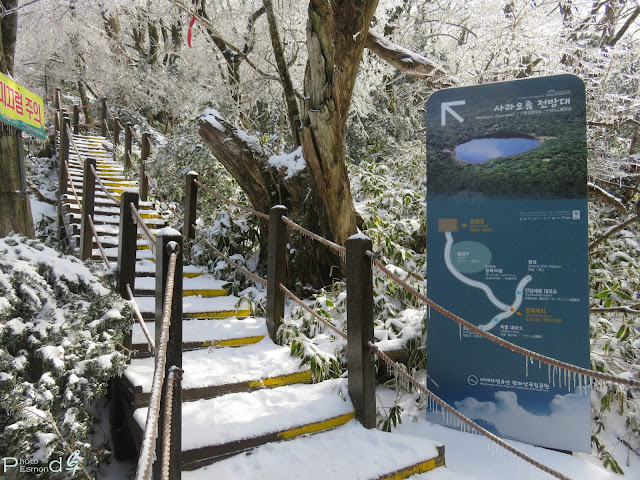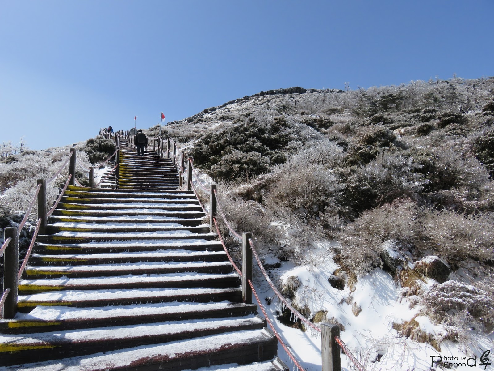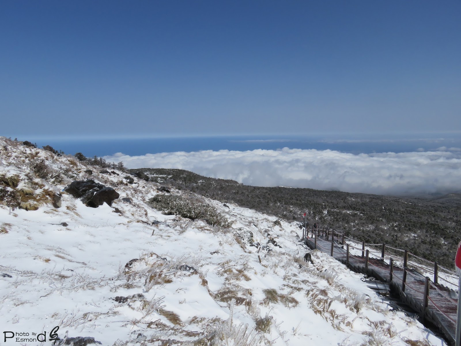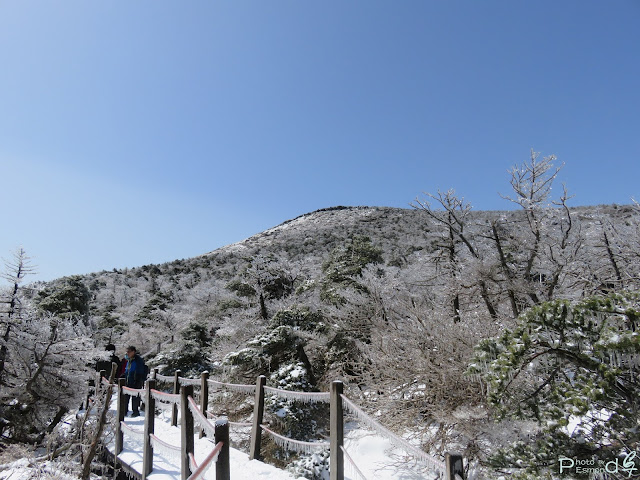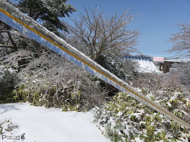 走着走着,我终于可以望到汉拿山山顶了!接下来的路就是沿着这些木制的梯阶往上走。这个看似最容易的部分反而是我全程攻顶最花时间的路段。原因很简单,这些梯阶上都结了一层薄冰,而我向住宿租借的雪爪碰巧坏了,我也没有拿珮珮的雪爪开始攻顶。现在我需要非常的小心一步一步的往上走,不然我很容易就会滑倒。