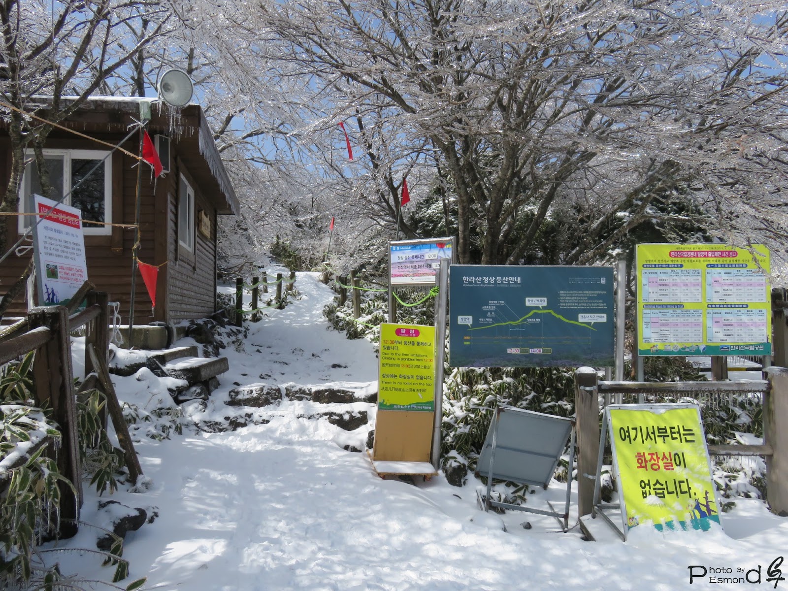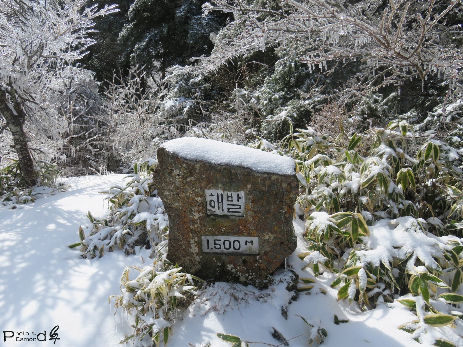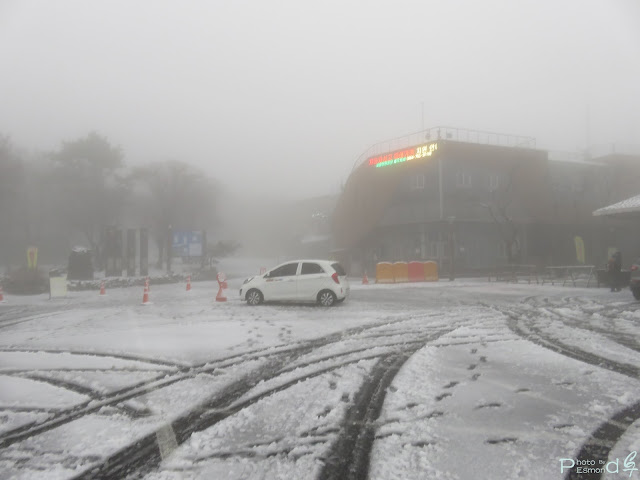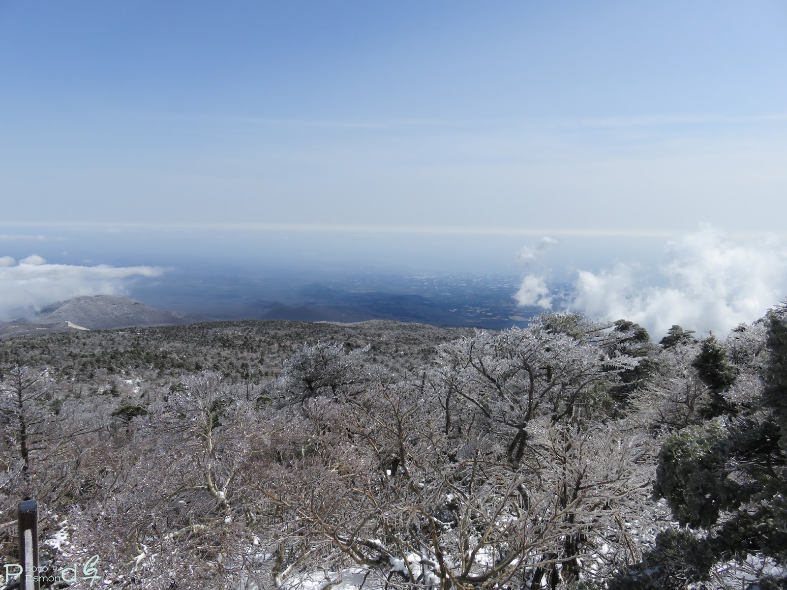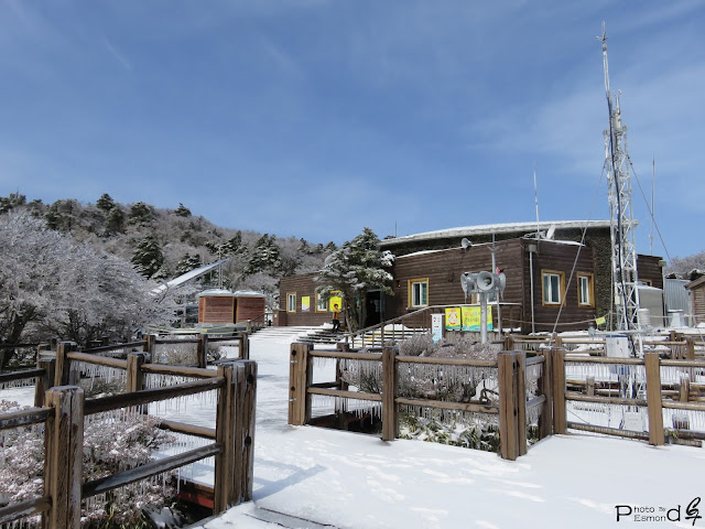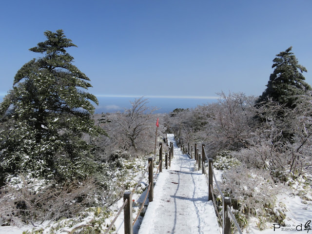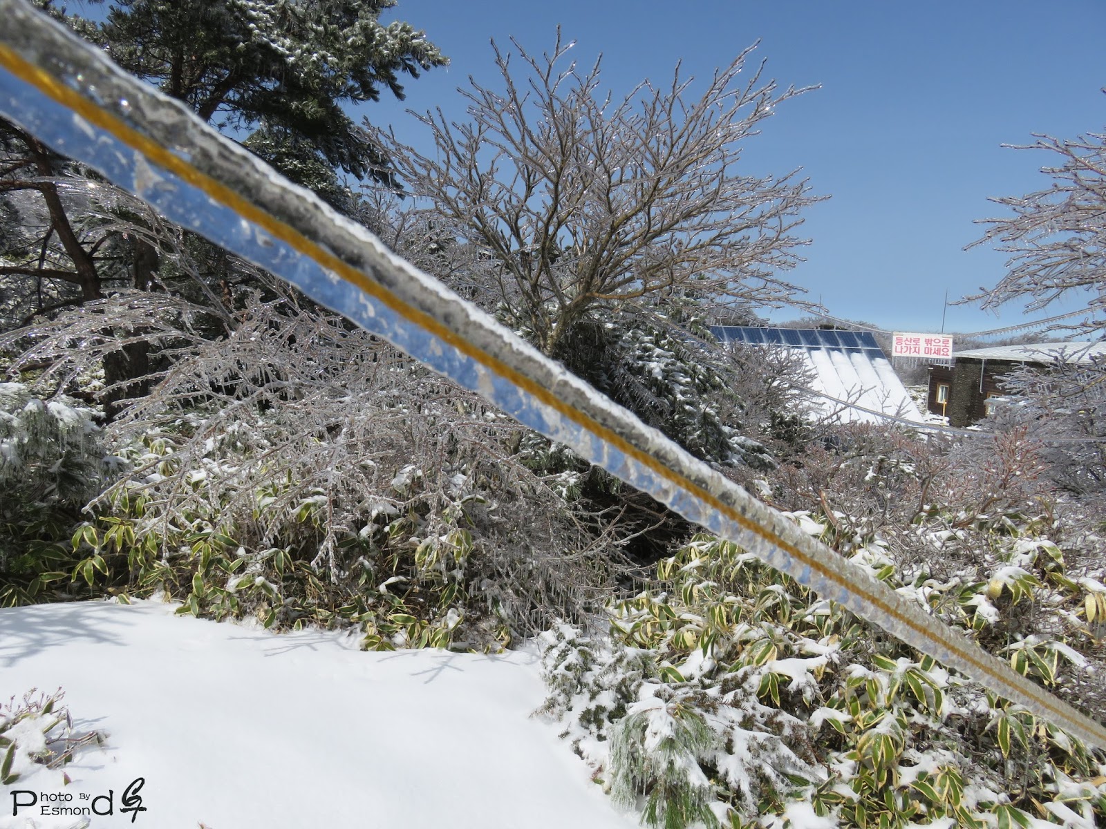 走着走着,我终于可以望到汉拿山山顶了!接下来的路就是沿着这些木制的梯阶往上走。这个看似最容易的部分反而是我全程攻顶最花时间的路段。原因很简单,这些梯阶上都结了一层薄冰,而我向住宿租借的雪爪碰巧坏了,我也没有拿珮珮的雪爪开始攻顶。现在我需要非常的小心一步一步的往上走,不然我很容易就会滑倒。