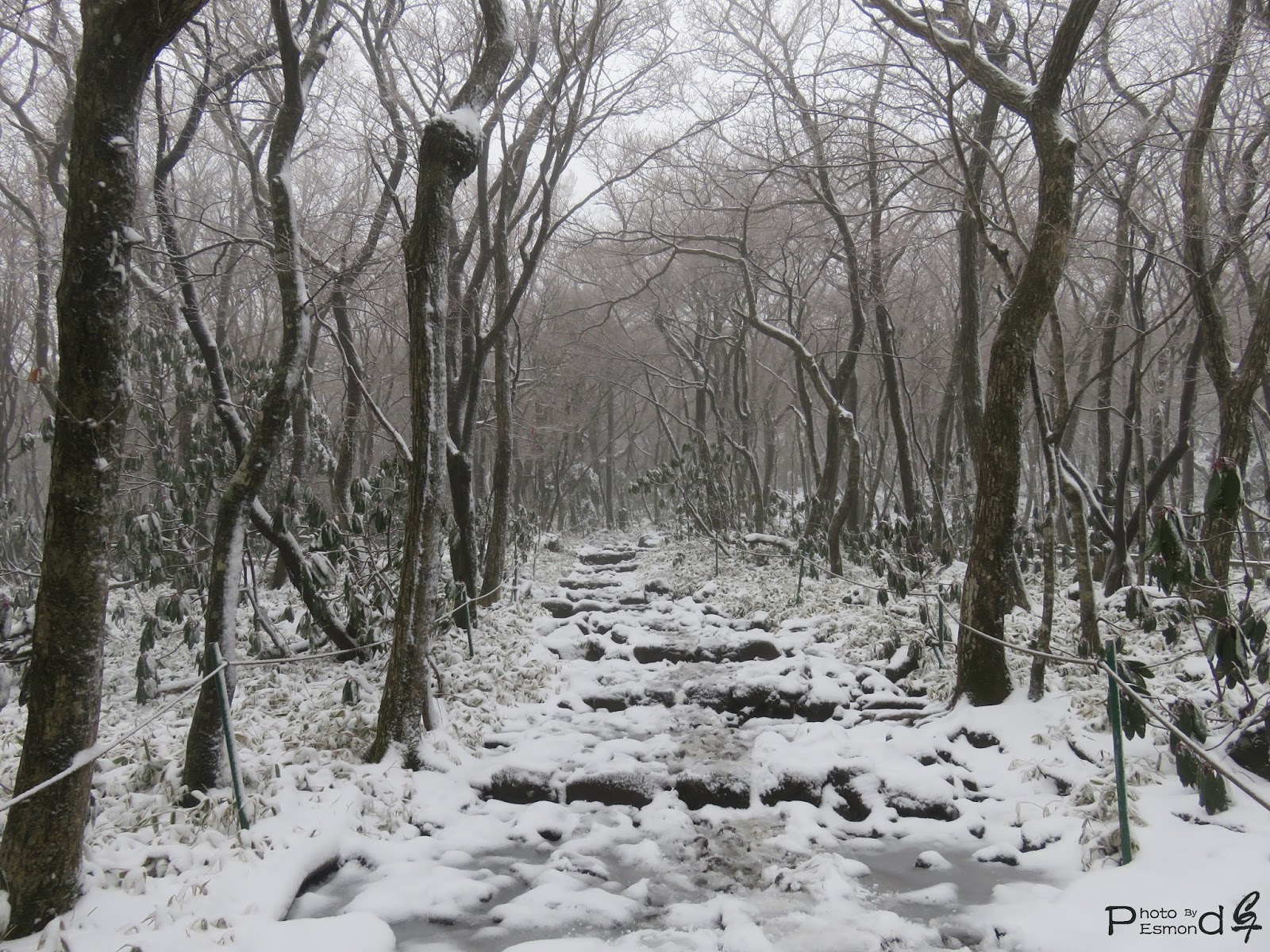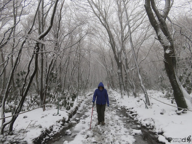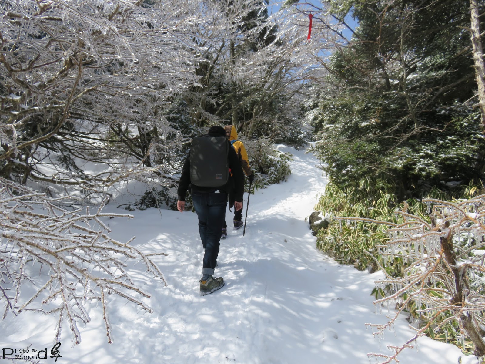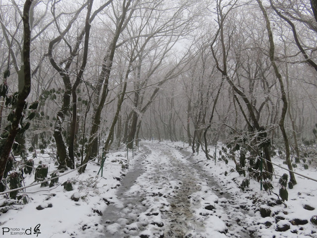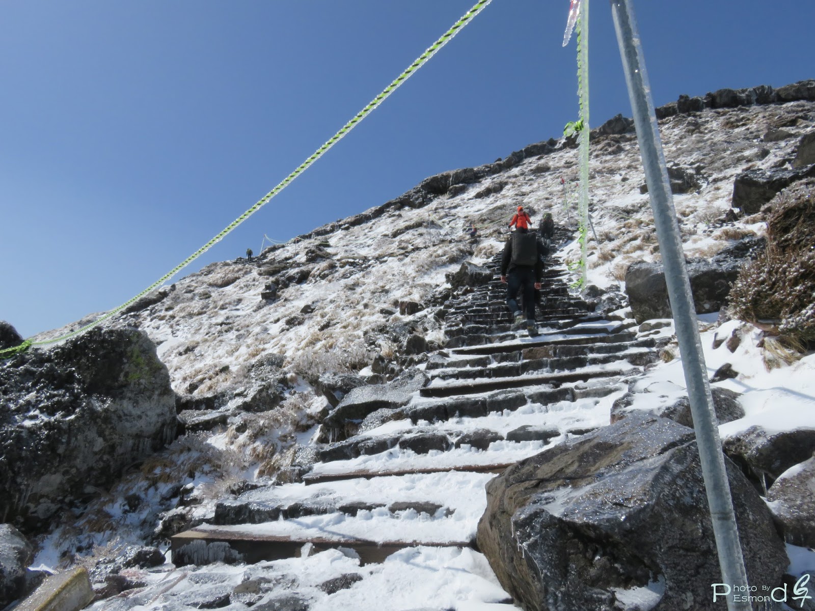 经过了杜鹃田掩蔽所后的山路,难度一下提升不少。这一段攻顶的山路变得很陡,就连我也不得不一直停下休息。这段山路,从掩蔽所去到顶峰全长2.3公里。在这短短的2.3公里,登山客需要从海拔1500米走到顶峰,海拔1950米,就在这2.3公里内需要提升450米的高度。。。虽然山路蛮陡,很吃体力,但是这段山路却因为下雪,有了积雪的关系反而变得容易了一些。