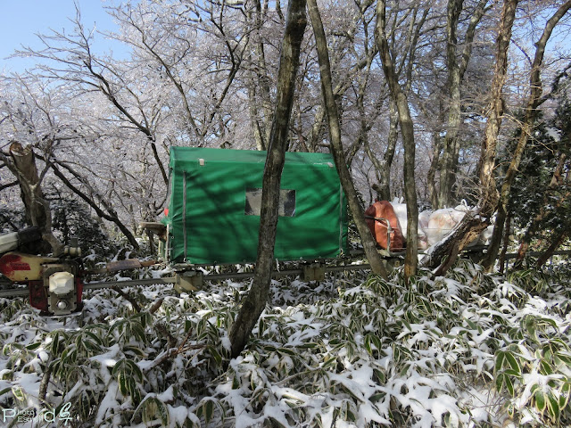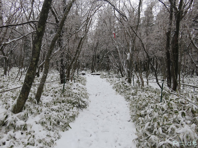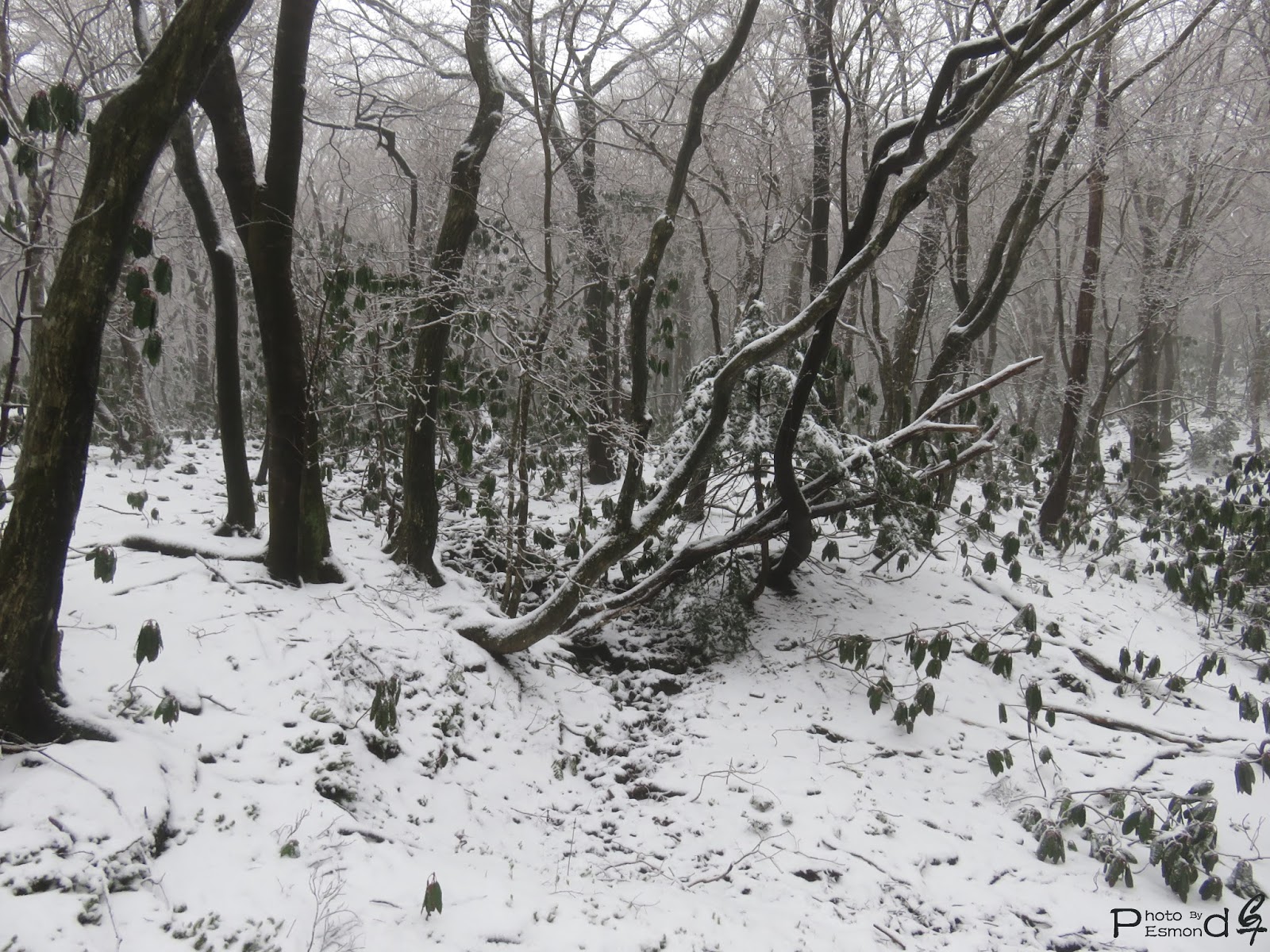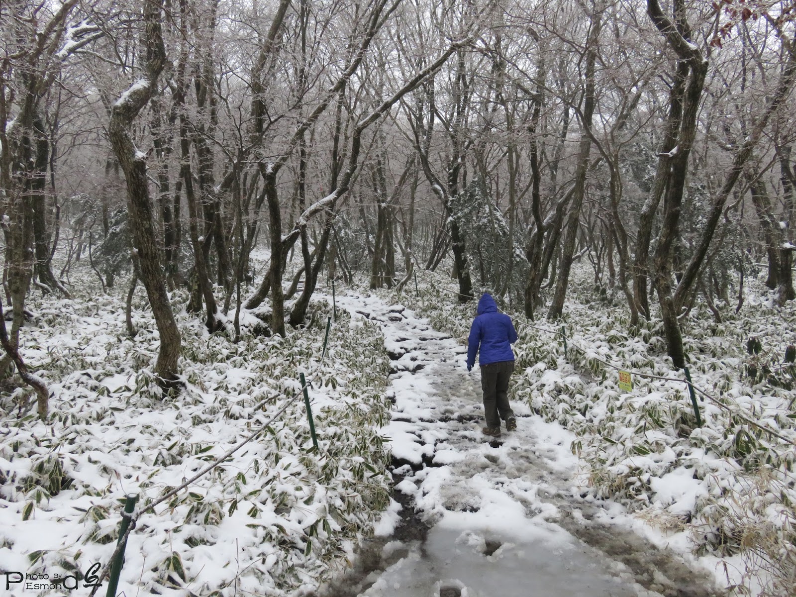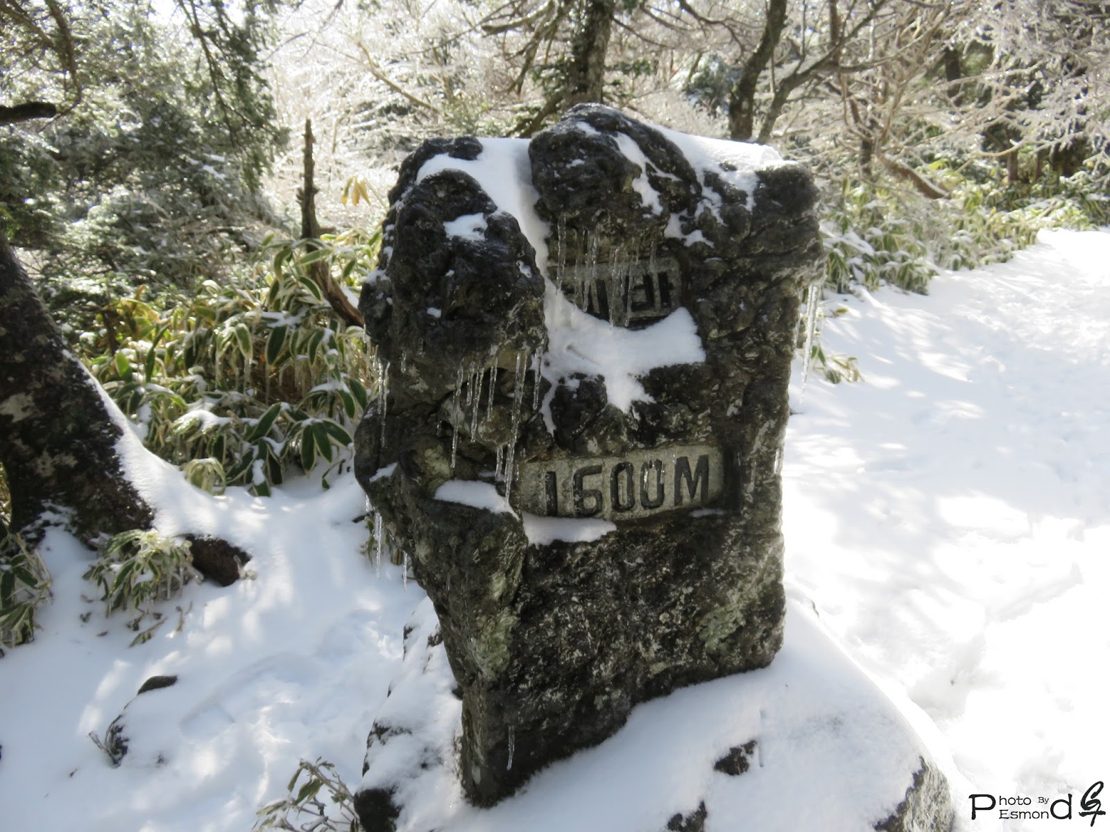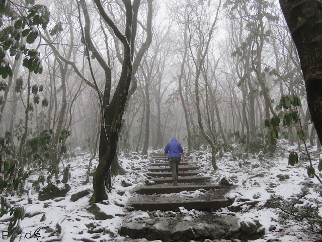 经过了杜鹃田掩蔽所后的山路,难度一下提升不少。这一段攻顶的山路变得很陡,就连我也不得不一直停下休息。这段山路,从掩蔽所去到顶峰全长2.3公里。在这短短的2.3公里,登山客需要从海拔1500米走到顶峰,海拔1950米,就在这2.3公里内需要提升450米的高度。。。虽然山路蛮陡,很吃体力,但是这段山路却因为下雪,有了积雪的关系反而变得容易了一些。