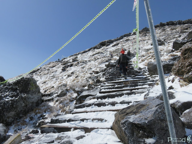 这段路除了结冰外,还有一个令我举步艰难的因素--风、强风。越是靠近山顶,风就越强。我一来因为没有雪爪的关系,本身已经很难在平衡了,再加上一阵阵的强风,我还真的害怕自己会被吹下山。。。很多时候我都直接用手绕着护栏或绳子前行。