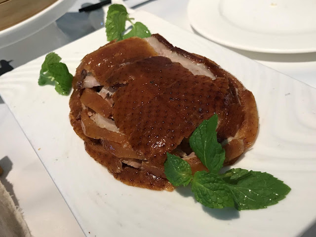 這裡的烤鴨可以點整隻或半份,我們點的是半份 片好的鴨皮擺得非常漂亮 但很奇怪的是,雖然每個座位旁邊都有片鴨台, 但不知怎麼的,師傅送烤鴨後,就背對著我們片鴨子, 我跟朋友都已經拿著手機準備錄影了~ 後來看他到別桌也是這樣,好奇怪。 不過這裡要吃全套的烤鴨,醬汁、荷葉餅全部都要另外收費, 沒辦法,這就是中國餐廳的特色,東西還沒點,就要收一堆怪怪的費用了 幸虧這裡不收碗盤的清潔費和茶位費。 這邊除了基本的甜麵醬、京蔥絲、黃瓜絲和砂糖外, 還有黃芥末醬、山楂條,還有兩種不知是什麼醃漬物。