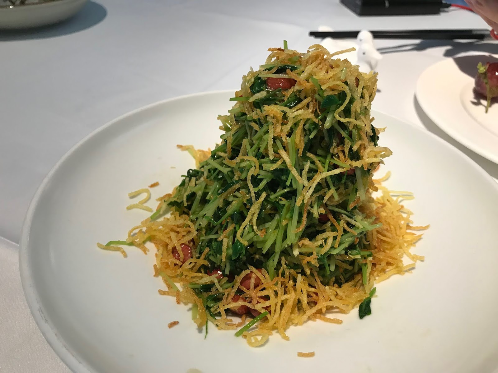 我們人不多,吃不了太多東西,大姐見我們是國外來的, 就推薦點幾道北京味的美食,首先上桌的是巧拌豆苗,是一道涼菜, 吃起來味道比想象中的好,酸甜帶點微辣,裡面還配合一些脆條和花生 增加一些酥脆的口感,很快就被掃光了,很適合當前菜。