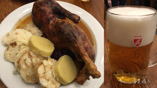 lvet 说城堡区的餐厅较贵,她叫我到小区的 Klášterní pivovar Strahov 吃午餐。这里卖的都是具有代表当地的特色美食。在布拉格以肉食为主,最常见的就是炖肉 Guláš 搭配 口感 Q 弹的 面包团子 Houskove Knedliky ,外加 一杯酒,一餐下来才 10 欧,很划算。