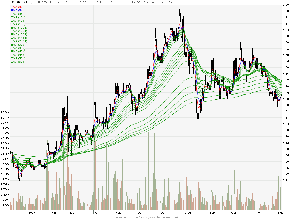 上面那四條白線股民老張稱呼它作 "漁網",我想應該是年線和三條接近年線的均線所組成的。。。