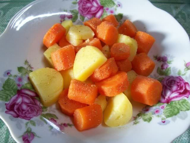 2. 煮滚一锅水, 加少许食油和盐, 放入红罗卜和马铃薯水煮至熟.