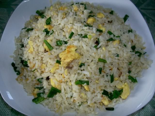 超简单的蛋炒饭, 只用了蒜米, 盐, 鸡蛋, 和青葱来炒, 连生抽酱油都省了.