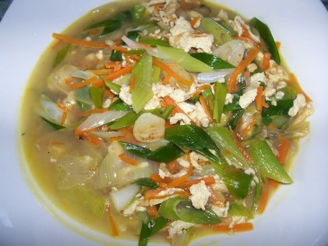2. 加入红罗卜炒一下, 才放蒜苗和适量的水拌炒.