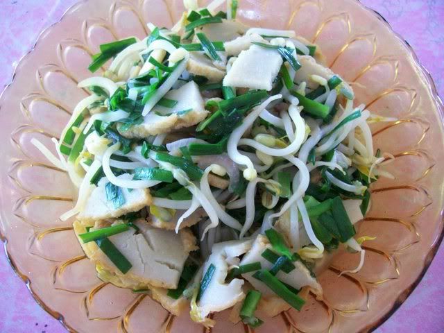 韭菜炒豆芽, 我加了些鱼饼一起炒.