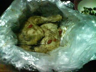 用了包装药材鸡的料,两只鸡尾,两汤匙水,红枣及枸屺用锡纸包起来,密封蒸一个小时。包装药材的份量是给一只鸡,我只放了1/3包的份量。开起时有浓浓的药材香,鸡腿嫩嫩的,好吃。如果加多点水,它的汤汁一定很好喝。