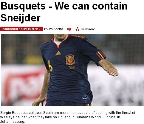 再过两天就将迎来决赛,布斯克茨指出斯奈德是荷兰队中最为可怕的人物,“他是一名伟大的球员,国米的三冠王足以证明他的可怕之处。”不过,布斯克茨并非长别人志气灭自己威风,他说,“我们所有人会众志成城,去防守和冻结他。在前面的比赛中,我们也成功冻结了不少优秀的球员,希望在面对斯内德的时候,我们还可以做到这点。” |