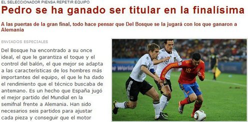 《每日体育报》指出托雷斯将毫无疑问的成为半决赛后的牺牲品,由于佩德罗的速度能在边路和反击中制造巨大威胁,博斯克在对德国赛后公开赞扬了佩德罗,因此这位巴塞罗那天才仍将在决赛中首发。相反,在世界杯前还处于伤病康复期的托雷斯,不得不坐到板凳上,他在前5场比赛中缺乏闪光的表演,已经让博斯克失去了耐心。