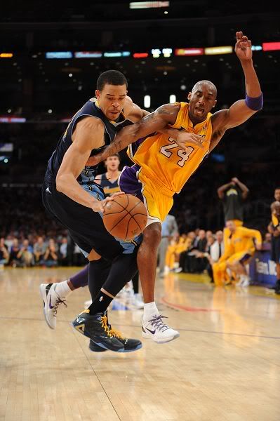 掘金开场就对拜纳姆实行了严密的包夹,虽然小鲨鱼还是强行进攻拿下了本场的前2分,但是此后掘金的“半兽人”法瑞德和加里纳利联手发威,前五分钟过去之后以10-6领先湖人队。比赛进入暂停,随后伊班克斯和加索尔联手追到10-12。阿弗拉罗跳投得手,科比制造法瑞德的犯规2罚1中,双方展开了拉锯,进入下次暂停时掘金以18-15依然领先。米勒带队打出6-0的高潮,科比上篮命中,拜纳姆连得4分,湖人最终以23-26落后结束了首节比赛。科比7分,拜纳姆6分,法瑞德8分5篮板。