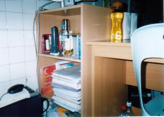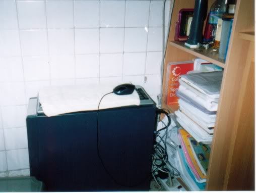 没有电脑桌,只好带LCD Monitor了,还是放在书橱上的咯!比较省位子! |