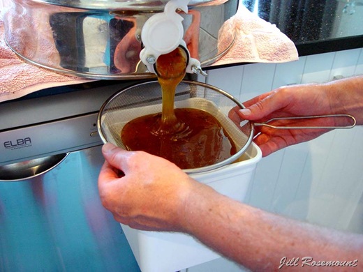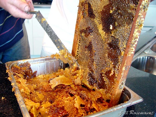 过滤一下就有干净的honey了。 上面那个刮掉的wax里面其实还有满多honey的。 整个wax拿去煮,然后放凉。 凉了后,开一个洞,wax里面的honey又会流出来了。