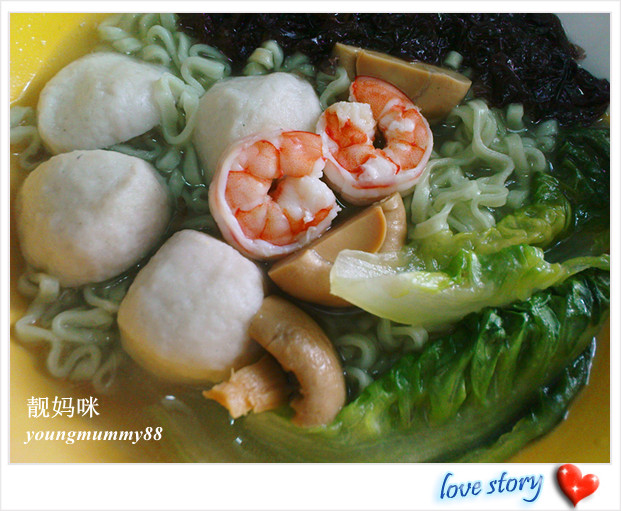 先把菠菜面放进锅里煮软,然后放sotong ball跟蘑菇煮一下后,加入油墨菜跟虾,汤再次滚起就可以关火了,最后才加进一小把紫菜就可以开动咯!