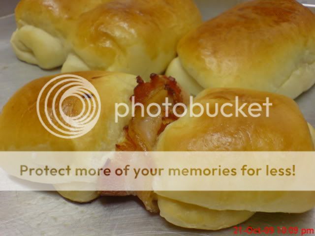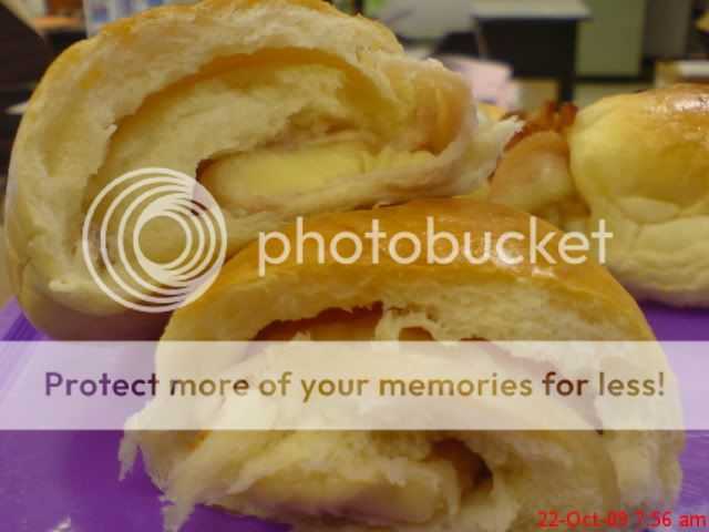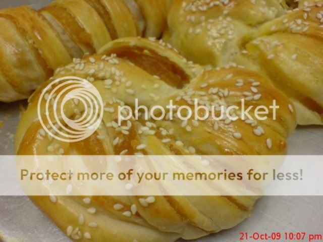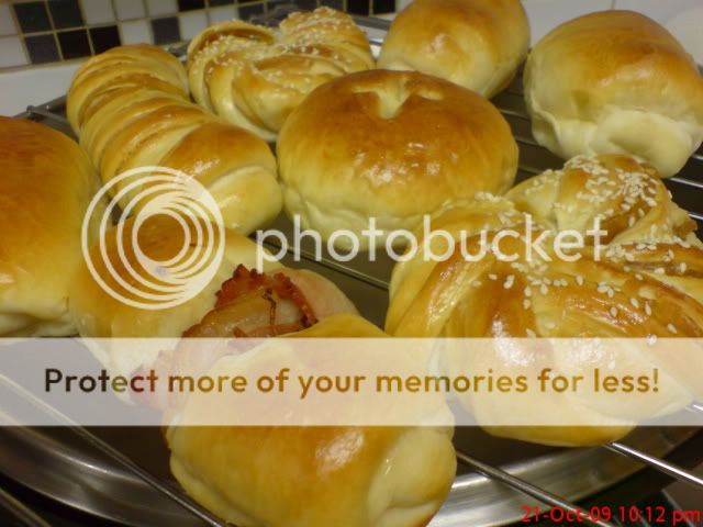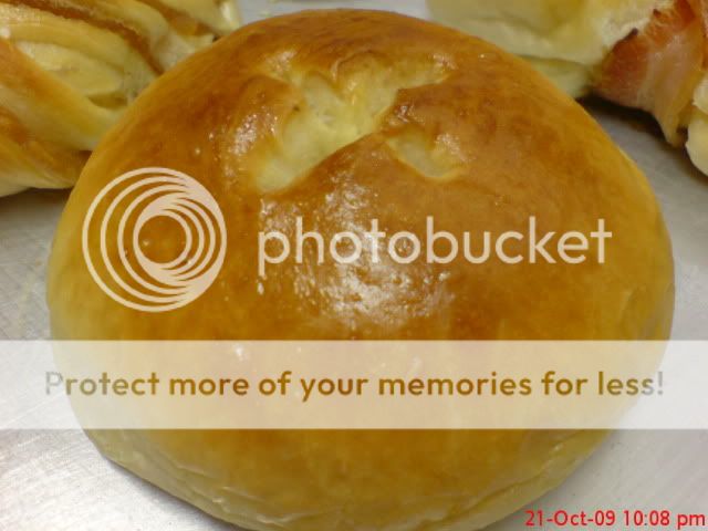 那天剩下的汤种做了这一些的花样面包,发觉这65度汤种好像真的有点不一样,通常面包在一烤好出炉时,表皮都是硬的,要过了一阵子才会变的软软的.但这面包在出炉时竟然是软到我以为还没有烤熟呢(虽然我已经烤了17分钟)结果不放心的我立刻将面包再烤了3分钟.面包到了今早吃时真的软得像外面卖的,但就比卖的重很多