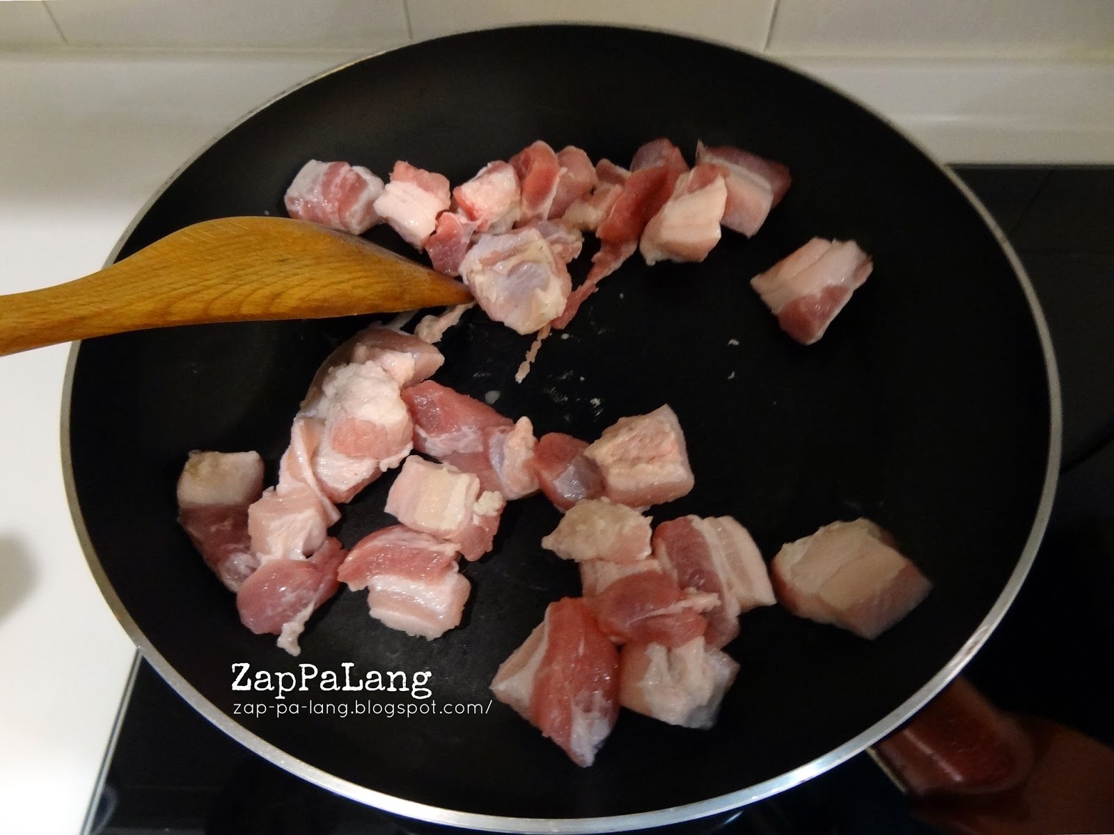 3. 烧热锅,放入花肉和姜片翻炒至花肉稍微渗出油份。