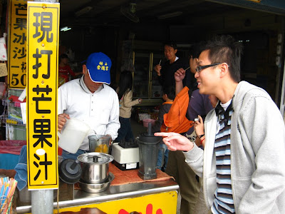 这现做的‘芒果汁冰沙’好好喝(英文为‘Mango Shake’)