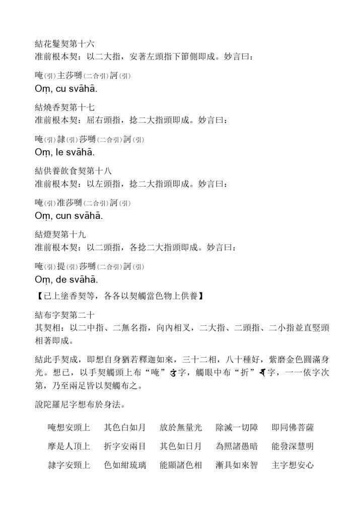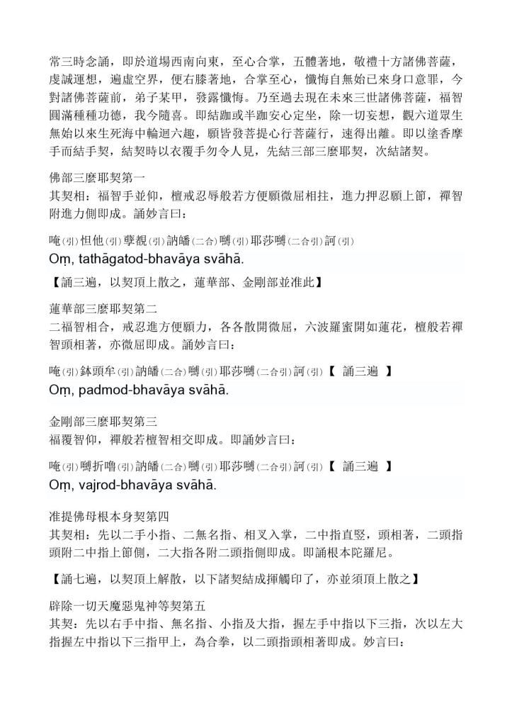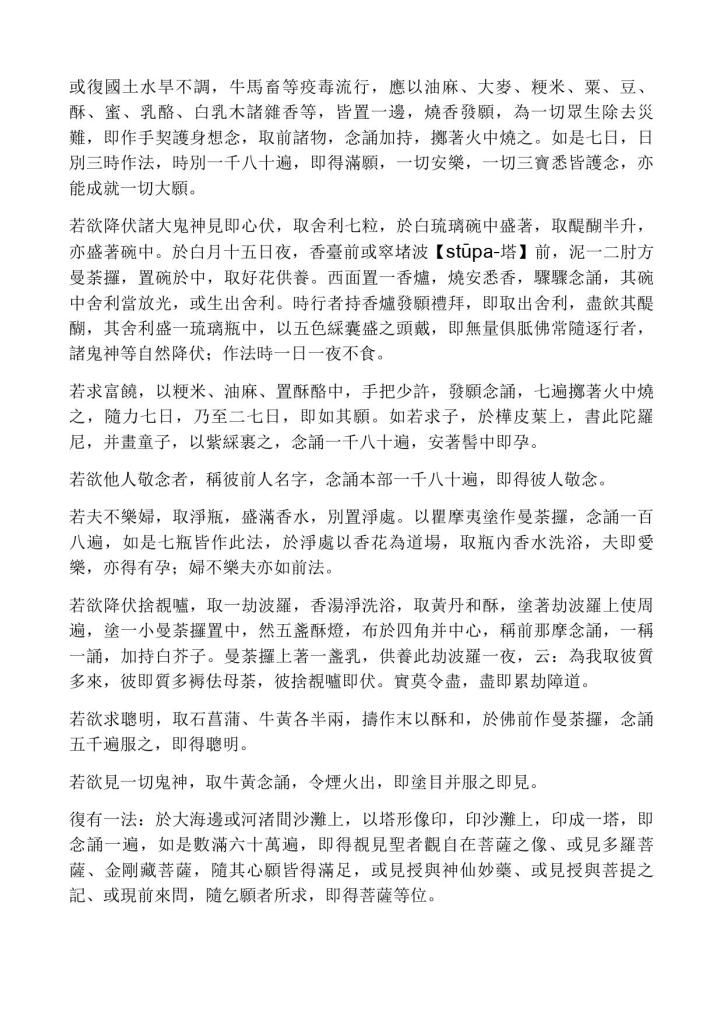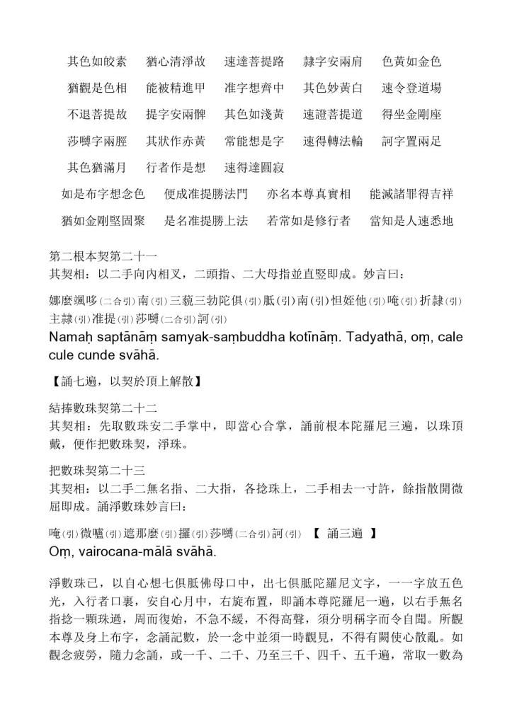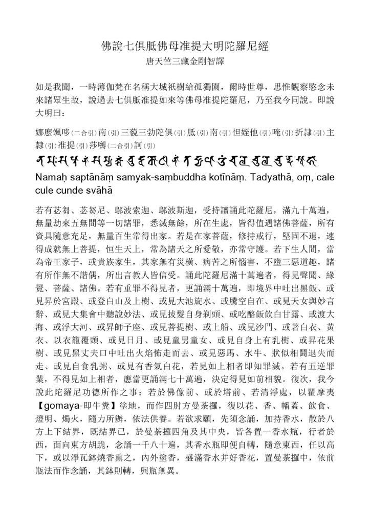 大唐天竺三藏地婆诃罗译 尔时佛在舍卫国祇树给孤独园。是时世尊思惟观察。愍未来诸众生故。说是七俱胝佛母心准提陀罗尼法。即说咒曰。 南谟飒哆南(一)三藐三勃陀俱胝南(二)怛侄他(三)唵折戾(四)主戾(五)准缔(六)娑婆诃(七) 若有比丘比丘尼优婆塞优婆夷。受持读诵此陀罗尼满八十万遍无量劫来所造五无间等。一切诸罪皆悉消灭。所在生处皆得值遇诸佛菩萨。所有资具随意充足。生生常得出家。具持菩萨律仪净戒。恒生人天不堕恶趣。常为诸天之所守护。若有在家善男女等诵持之者。其家无有灾横病苦之所恼害。诸有所作无不谐偶。所说言语人皆信受。若有诵此陀罗尼咒满十万遍。梦中得见诸佛菩萨声闻缘觉。自见口中吐出黑物。若有重罪诵满二十万遍。梦中亦见诸佛菩萨。亦复自见吐出黑物。若有五逆罪。不得如是善梦之者。宜应更诵满七十万遍。是时还得如前之相。乃至梦见吐出白色如酪饭等。当知此人即是罪灭。清净之相。 复次我今说此大陀罗尼所作之事。若于佛像前。或于塔前若清净处。以瞿摩夷涂地。而作方坛随其大小。复以花香幡盖饮食灯烛。随力所办而供养之。复咒香水散于四方上下以为结界。于坛四角及坛中央。皆各置一香水之瓶。持咒之者于其坛中。面向东方胡跪。诵咒一千八遍。其香水瓶即便自转。叉手捧杂花。咒千八遍。散一镜面。又于镜前正观。诵咒亦千八遍。得见佛菩萨像。应咒花百八遍。而散供养。随请问法无不决了。若有鬼病以咒茅草而拂病人即得除愈。若有幼小为鬼所著。以五色缕应令童女搓以为线。一咒一结满二十一。用系其颈。以芥子咒满七遍。散其面即便除差。 复次有法。于病者前墨画其形。咒杨枝打之。亦便除差。 复次有法。若有病人为鬼所著身在远处。应咒杨枝具满七遍。寄人持打即亦除差。 复次有法。若在路行诵此咒。无有贼盗恶兽等畏。 复次有法。常持此咒。设有诤讼无不获胜。若欲往渡江河大海。诵咒而渡无有水中恶兽等难。 复次有法。若被系闭枷锁禁其身。诵此咒者即得解脱。 复次有法若诸国土水旱不调。疫毒流行。应以酥和胡麻粳米。用手三指取其一撮。咒之一遍置火中烧。或经七日七夜。六时如是相续不绝。一切灾疫悉皆消灭。 复次有法。于河渚间砂潬之上。以印。印砂为塔形像。诵咒一遍印成一塔。满六十万遍。或见观世音菩萨。或见多罗菩萨。或见金刚主菩萨。随心所求皆得满足。或见授与仙药。或见与受菩提之记。 复次有法。右绕菩提树像。诵咒满千万遍。即见菩萨为其说法。欲随菩萨即得随从。 复次有法。若乞食时常持此咒。不为恶人恶狗等类之所恼害。若于塔前或佛像前或舍利塔前。诵持此咒三十万遍。复于白月十五日设大供养。一日一夜不食正念诵咒。乃至得见金刚手菩萨。而彼菩萨即将是人往于自宫。 复次有法。若于转法轮塔前或佛生处塔前。或从忉利天下宝阶塔前或舍利塔前。于如是等诸塔之前诵咒右绕。即见阿钵罗是多菩萨及诃利底菩萨。随其所愿皆悉满足。若须仙药即便授之。复为说法示菩萨道。若有诵此陀罗尼者。乃至未坐道场。一切菩萨常为善友。又此准提大陀罗尼大明咒法。过去一切诸佛已说。未来一切诸佛当说。现在一切诸佛今说。我今亦如是说。为利益一切众生故。令得无上菩提故。若有薄福众生。无少善根者。无有根器之者。无有菩提分法者。若得闻此陀罗尼法。速疾证得阿耨多罗三藐三菩提。若有人能常自忆念。诵持此咒。无量善根皆得成就。佛说此大准提陀罗尼法时。无量众生远尘离垢。得大准提陀罗尼大明咒功德。得见十方诸佛菩萨诸圣众等作礼而去。