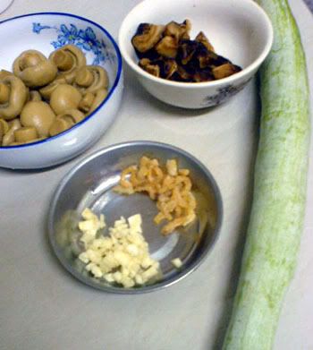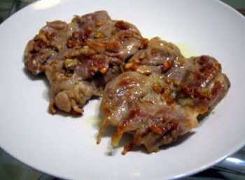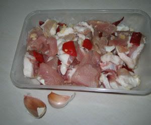 然后就爆香蒜米,下猪肉炒一会,加一些水,少许冰糖,三大匙醋慢火煮滚它,