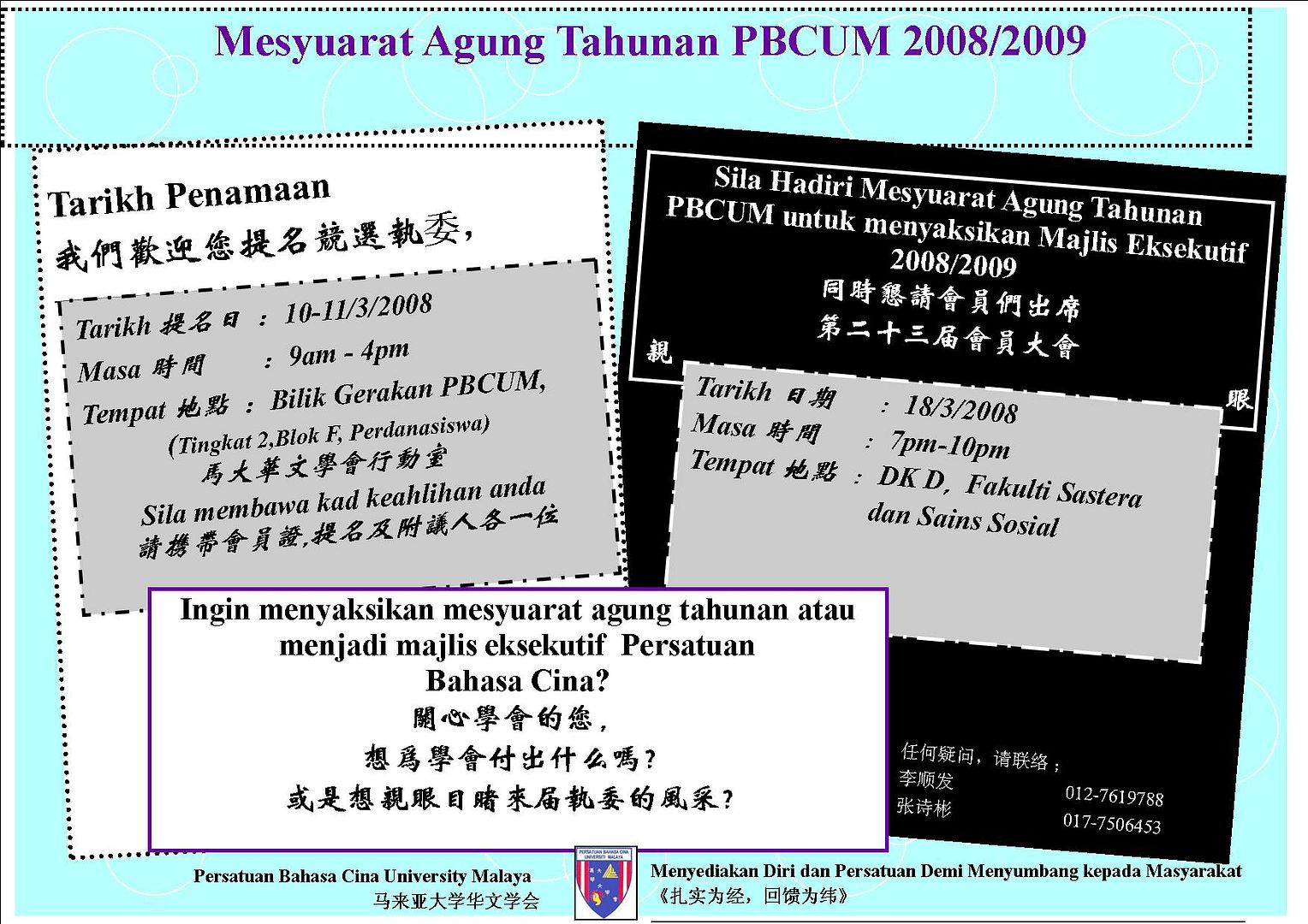 请携同会员证、提名人及附议人准时到来! 任何疑问,敬请联络: 李顺发 012-7619788 陈秀丽 012-7607328 张诗彬 012-7506453 组织兴亡,匹夫有责! 您,有权决定学会的未来!