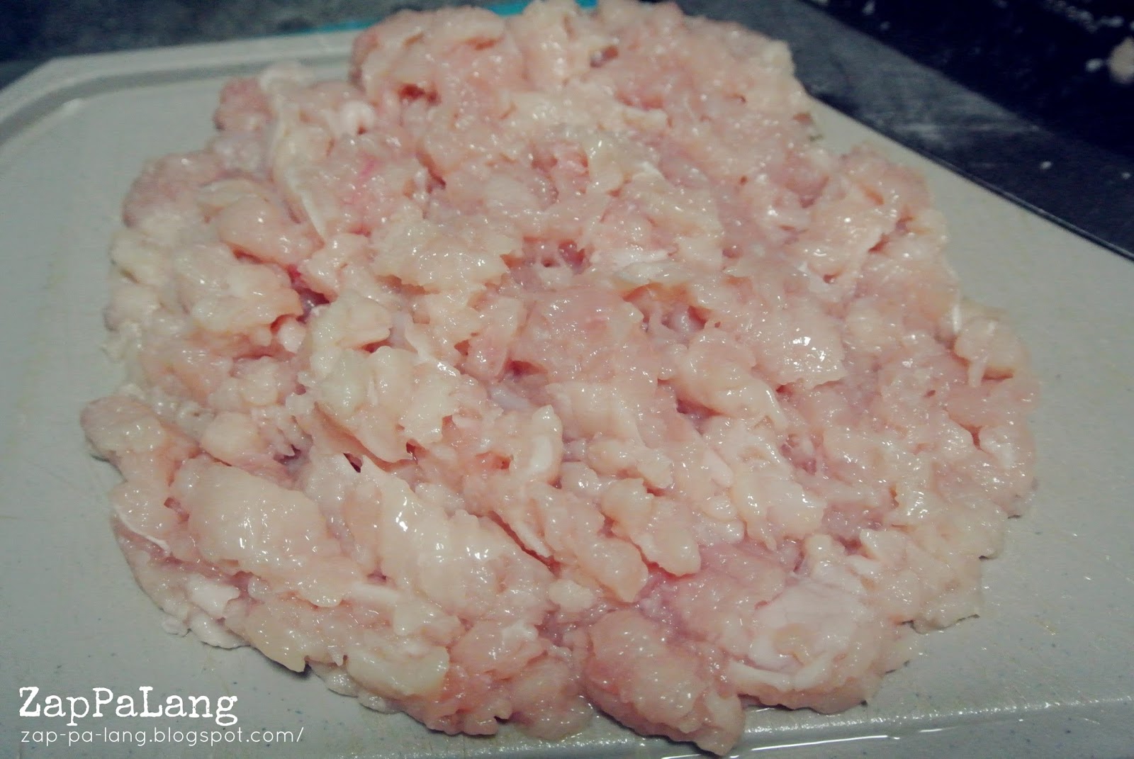1。鸡胸肉切条后用菜刀剁碎。(不用太碎, 大概就可以了)