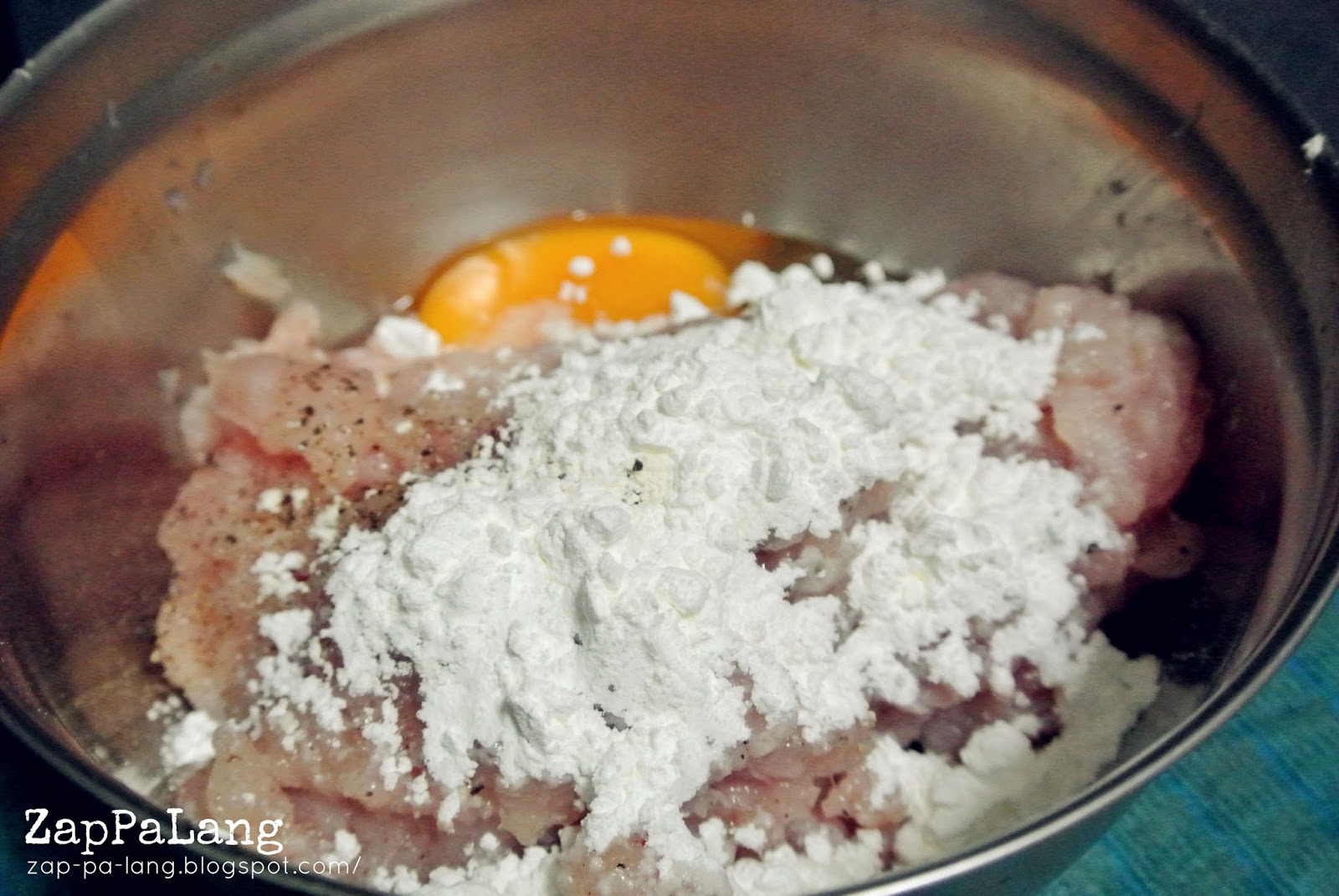 2。取一个大碗把1, 蛋,蒜粉, 黑胡椒, 盐和粟粉加入, 搅拌均匀至起粘性。