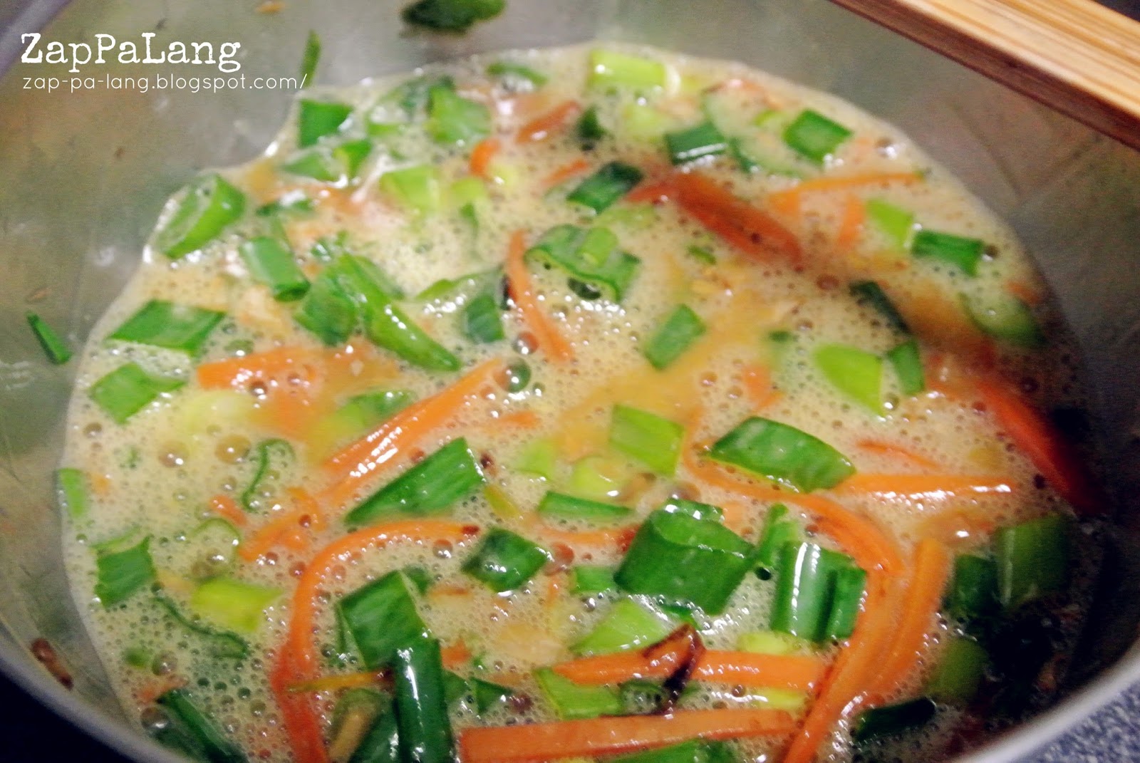 7。加入青葱碎,倒入蛋液。(由于红萝卜等材料很热,加入蛋液时要不停搅拌才不会变蛋花汤。)
