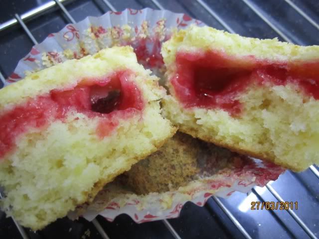 4. 把面糊倒入小纸杯里至一半满,放入适量的草莓果酱再把面糊倒至8分满。